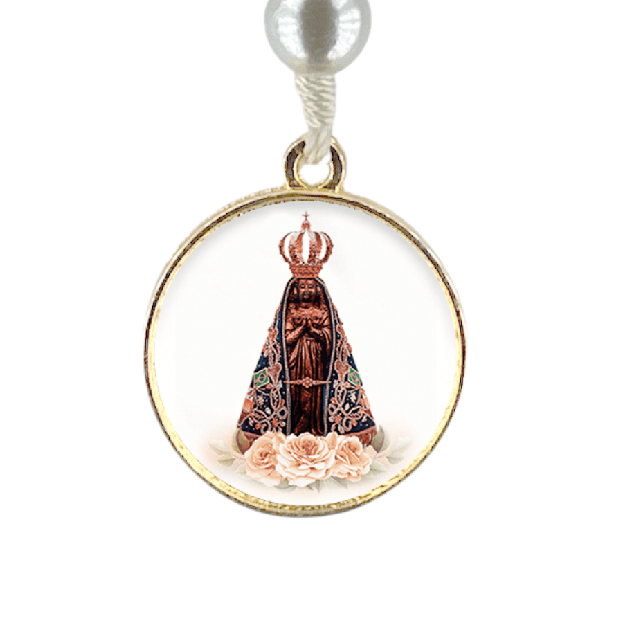 Medalha de Nossa Senhora Aparecida: Apresenta o entremeio com a imagem de Nossa Senhora Aparecida, símbolo de intercessão e carinho maternal.