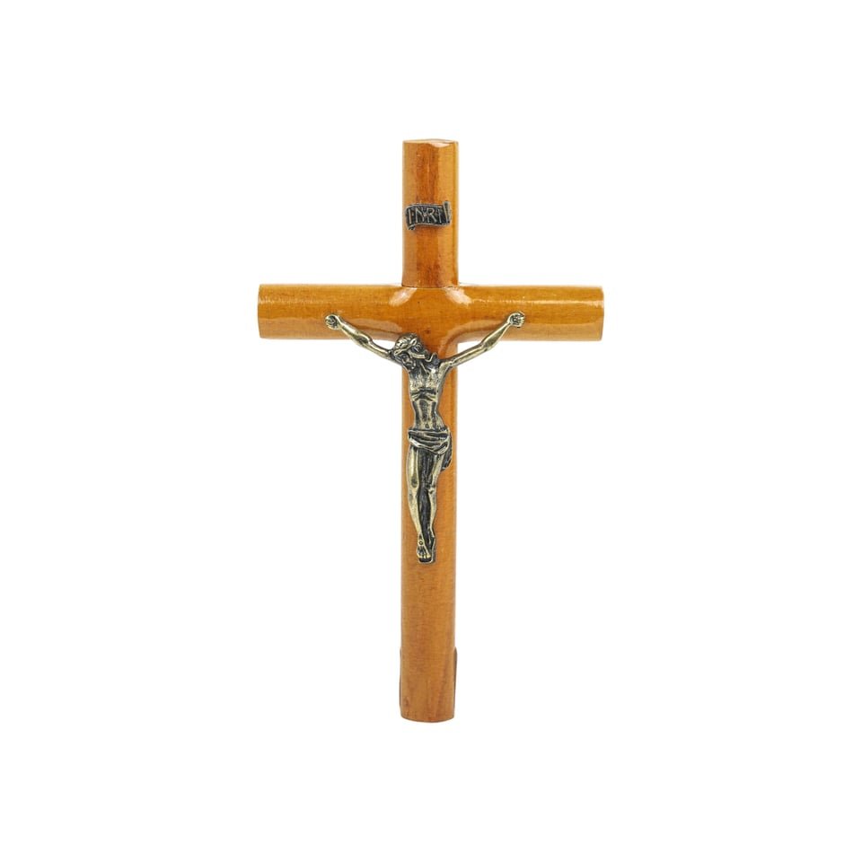 Para o seu estoque ficar completo, a Lírio do Vale Distribuidora de Artigos Religiosos traz para a coleção este crucifixo de parede! Feito em madeira de demolição, o produto com 19cm é arredondado. Jesus Crucificado e a placa escrita INRI são de metal na cor de ouro envelhecido. E para que o crucifixo seja colocado no local desejado, há um gancho de metal atrás dele.