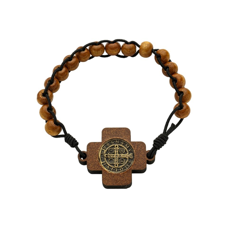 Dezena de pulso em madeira, na cor marfim, com elástico e medalha de São Bento em ouro velho com madeira.