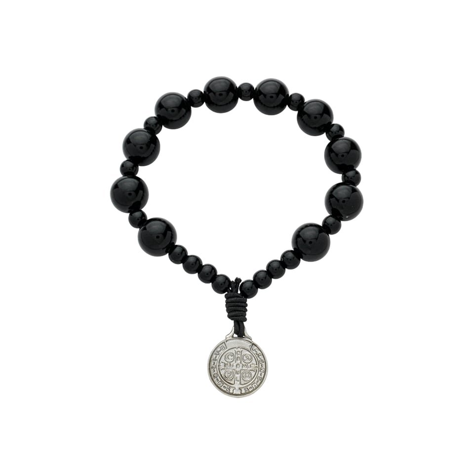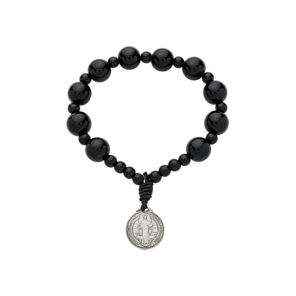Dezena de pulso com conta em pérola na cor preta, e medalha de São Bento prateada na ponta.