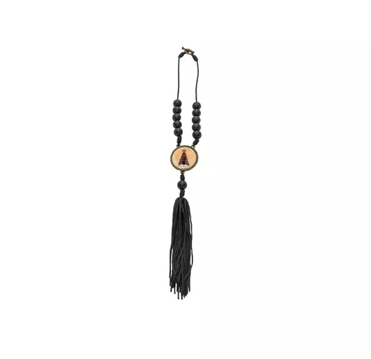 Acabamento com Pompom (Tassel): O detalhe final em franjas pretas (pompom) adiciona um movimento elegante à peça, seguindo as tendências de acessórios automotivos religiosos.