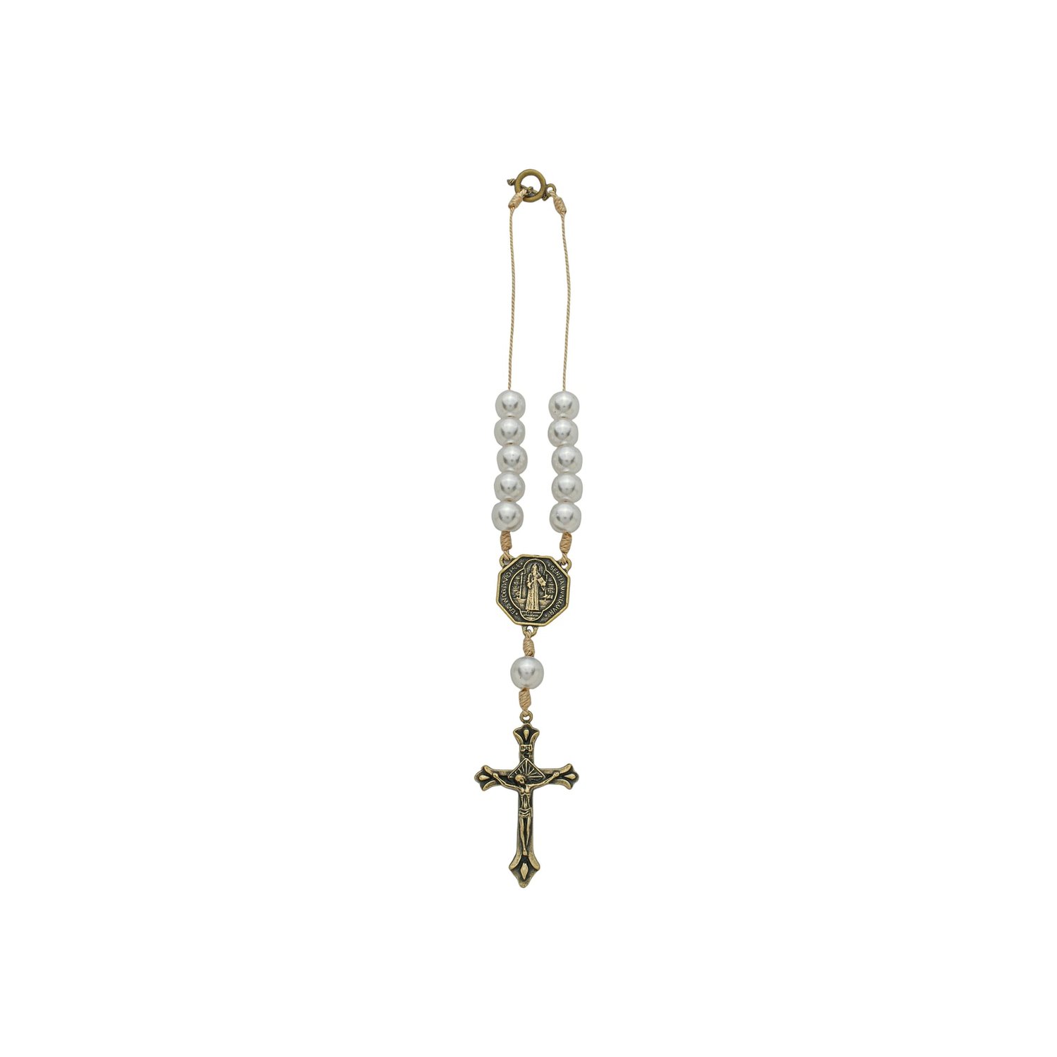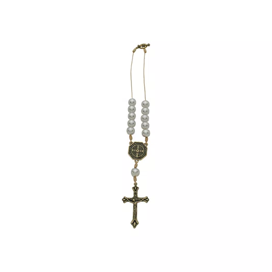O design é pensado para a praticidade no ambiente automotivo. A dezena conta com um fecho de fácil manuseio na extremidade superior, permitindo que seja fixada de forma rápida e segura no retrovisor interno ou em outros pontos do veículo. O entremeio apresenta a Medalha de São Bento em formato octogonal, rica em detalhes, complementada por um crucifixo tradicional, ambos com acabamento em ouro velho que garante durabilidade e resistência à exposição solar comum no interior dos carros.