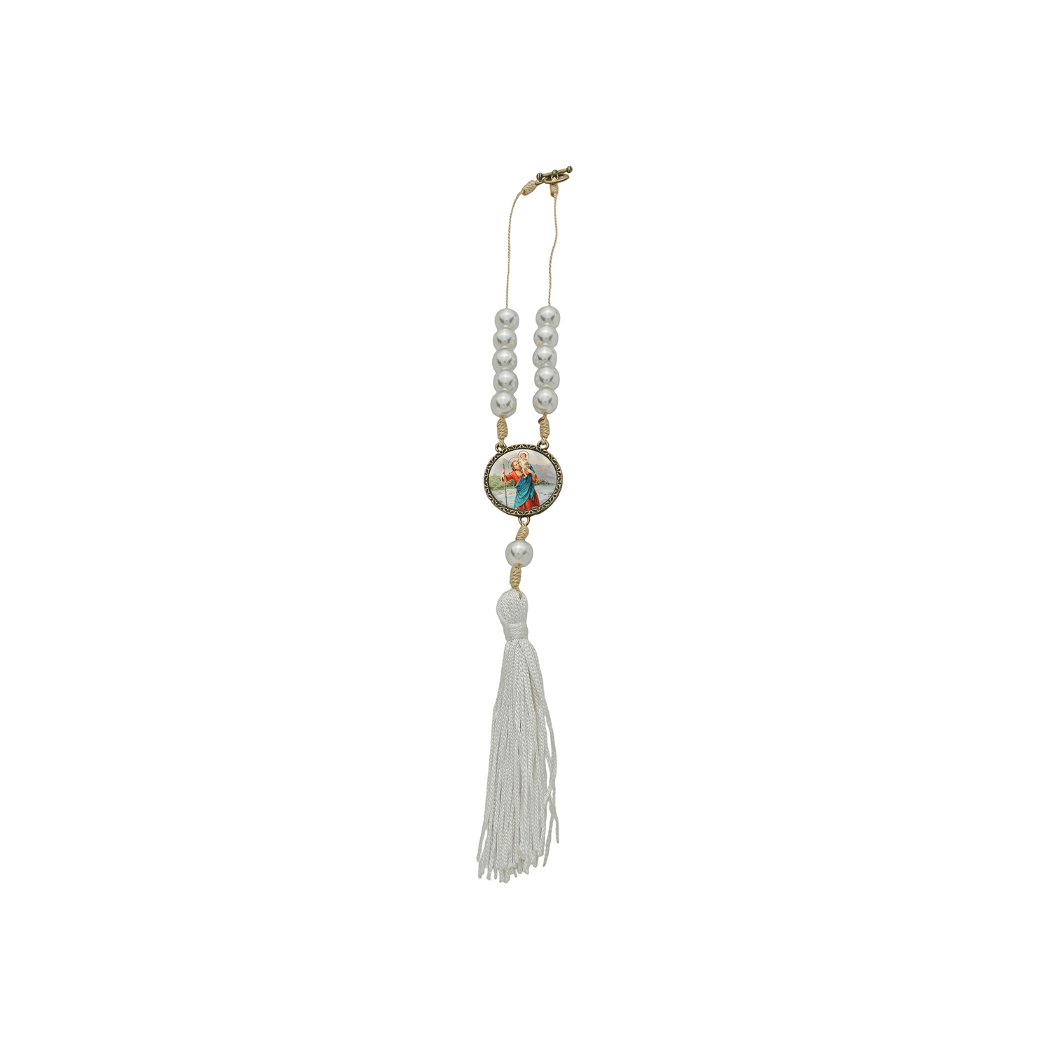 O design da peça foca na elegância e na praticidade. Apresenta uma medalha central com a imagem colorida de São Cristóvão atravessando o rio com o Menino Jesus, protegida por um acabamento em ouro velho. O grande destaque estético é o pompom (tassel) branco posicionado abaixo da medalha, que confere um toque de sofisticação artesanal ao acessório. Para garantir a conveniência do motorista, a dezena inclui um fecho de fácil manuseio na extremidade superior, permitindo uma fixação rápida e segura no retrovisor interno.