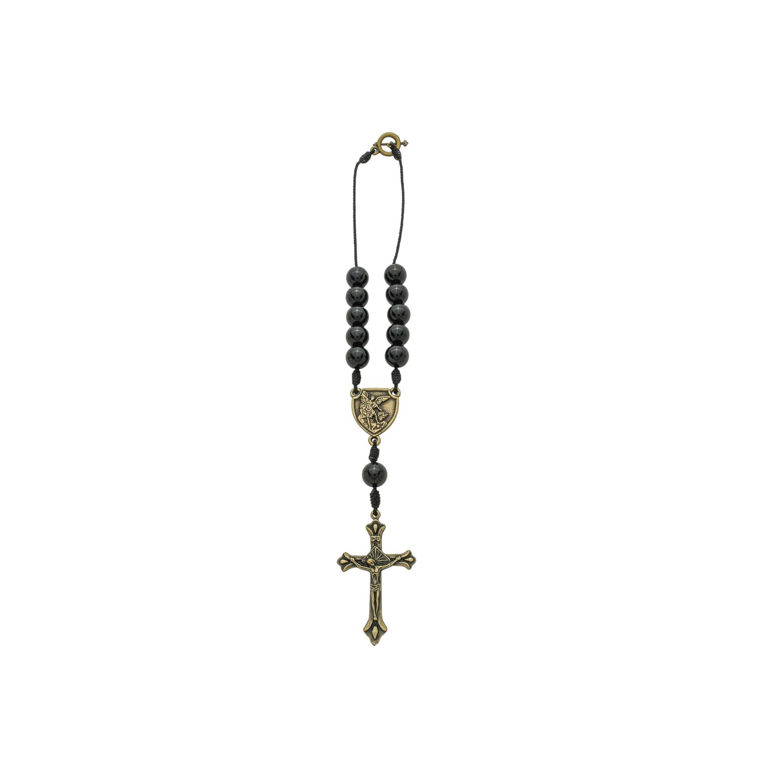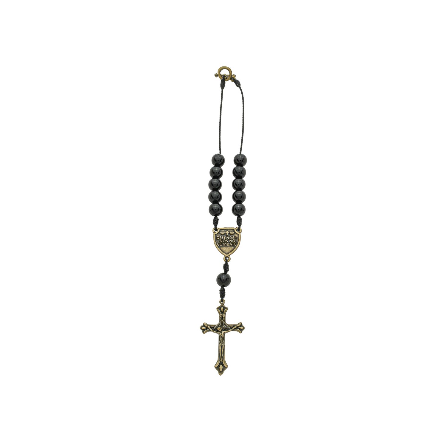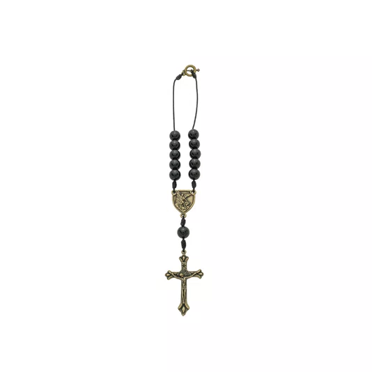 O design prioriza a funcionalidade e o simbolismo. A dezena conta com um fecho de fácil manuseio na extremidade superior, que permite uma fixação rápida e segura no retrovisor interno do veículo. O conjunto é harmonizado por metais em ouro velho, incluindo um entremeio detalhado com a imagem de São Miguel e um crucifixo robusto, reforçando a identidade de fé e combate espiritual da peça.