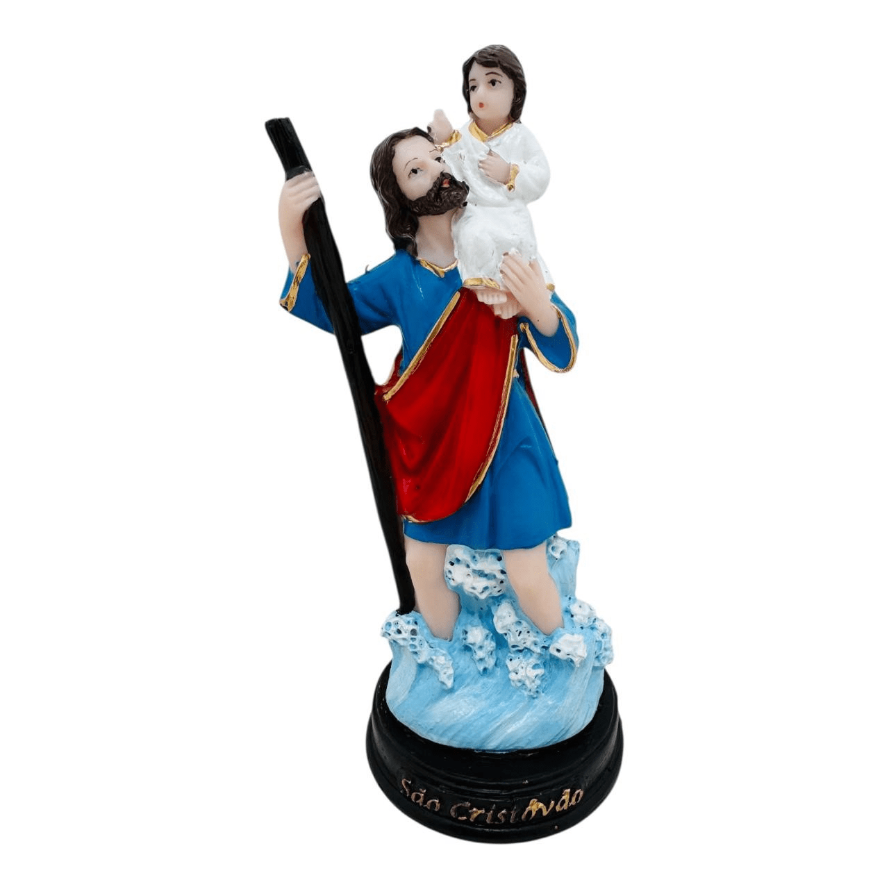 Essa é uma linda imagem de São Cristóvão da Lírio do Vale Artigos Religiosos feita em resina nacional com um perfeito acabamento. O santo traz em uma de suas mãos um cajado e com a outra ampara o Menino Jesus que está sentado em seu ombro. O Menino Jesus carrega um globo em sua mão esquerda. A túnica de São Cristóvão é azul e seu manto vermelho. Com uma ótima pintura feita à mão esse é mais um lindo produto de qualidade disponível em nosso catálogo! A imagem pode ornar locais da casa como sala, oratórios, quarto e também ambientes de trabalho e paróquias! São Cristóvão é o padroeiro dos viajantes e motoristas e essa linda imagem é uma boa alternativa para presentear familiares e amigos! Aproveite e garanta aqui essa peça para sua loja e leve essa devoção a mais pessoas!