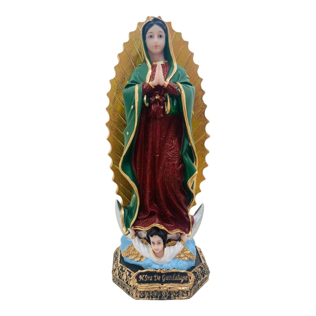 A imagem de Nossa Senhora de Guadalupe que temos disponível no maior tamanho é de 28cm. Todas as nossas peças são produzidas em resina de alta qualidade, com acabamento delicado e cheio de detalhes.