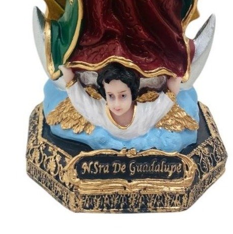 Linda e exclusiva imagem de Nossa Senhora de Guadalupe esculpida e pintada à mão. Confeccionada com resina de alto padrão, é cheia de detalhes e tem ótimo acabamento. A Virgem de Guadalupe é apresentada sobre uma base marrom escuro com a inscrição: "NS de Guadalupe" pintada em dourado.
