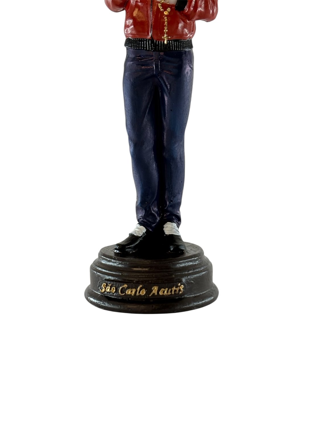Base: A peça repousa sobre uma base sólida com o nome "São Carlo Acutis" gravado em letras douradas, conferindo estabilidade e elegância para exposição em altares ou estantes.