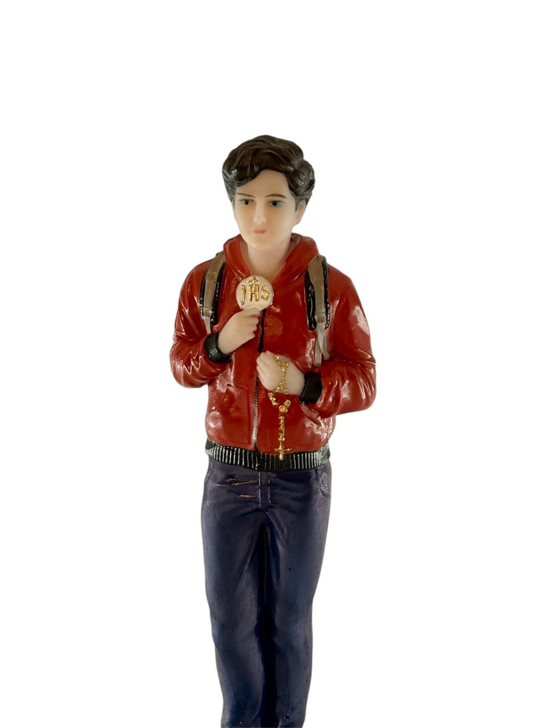 Esta imagem é confeccionada em resina de alta durabilidade, material que permite um nível de detalhamento e realismo superior. Com 15cm de altura, a peça retrata fielmente a iconografia do "Ciberapóstolo da Eucaristia": o jovem Carlo é representado com suas vestes características (calça jeans e jaqueta vermelha) reforçando sua proximidade com a realidade cotidiana dos fiéis.