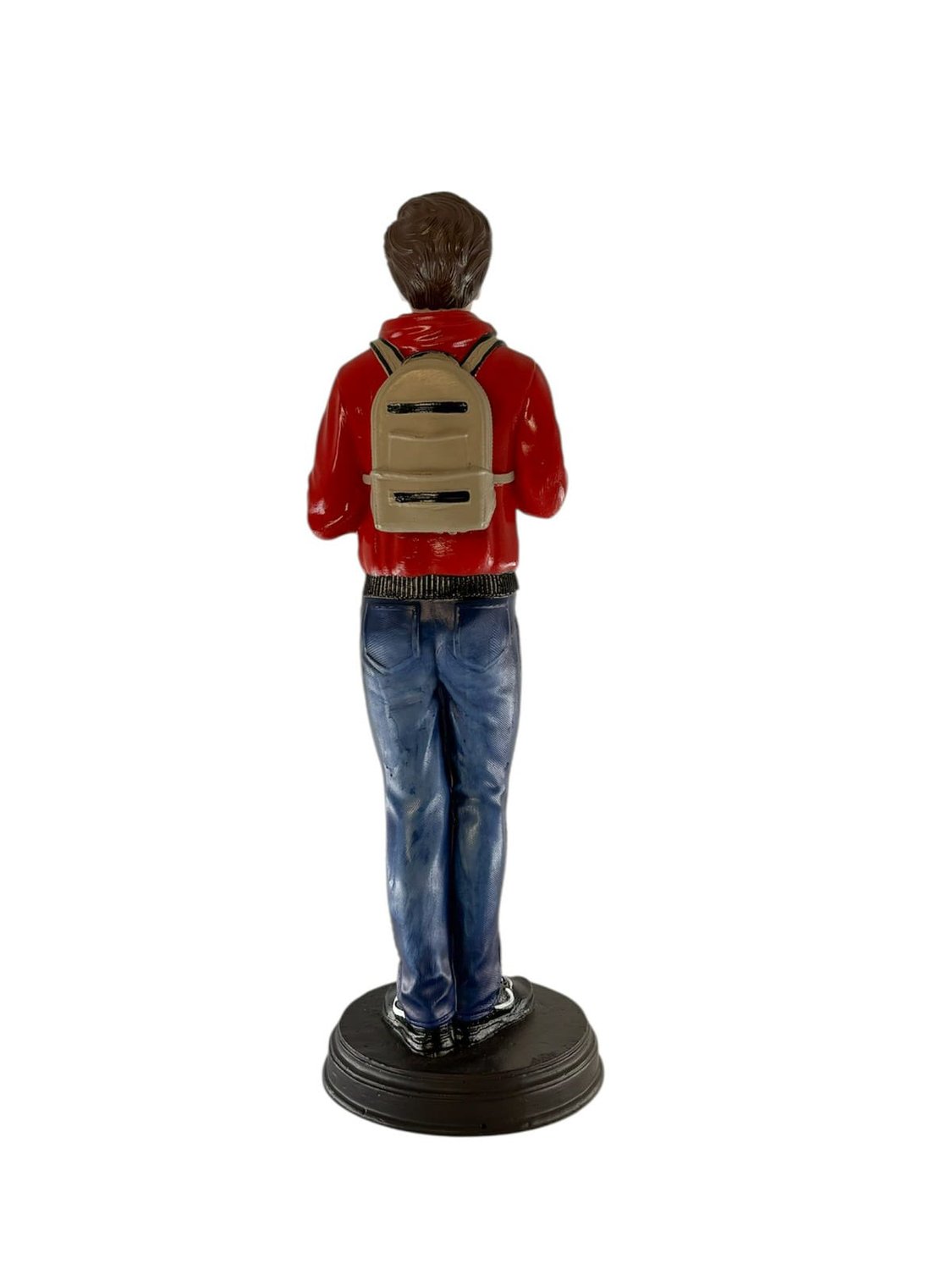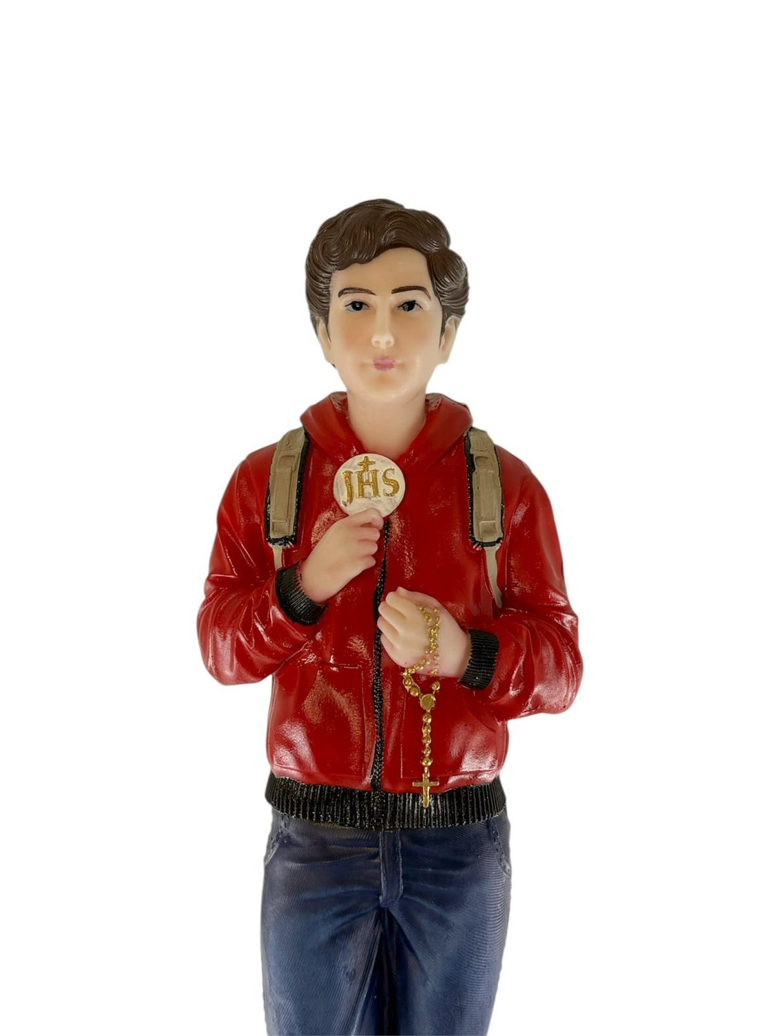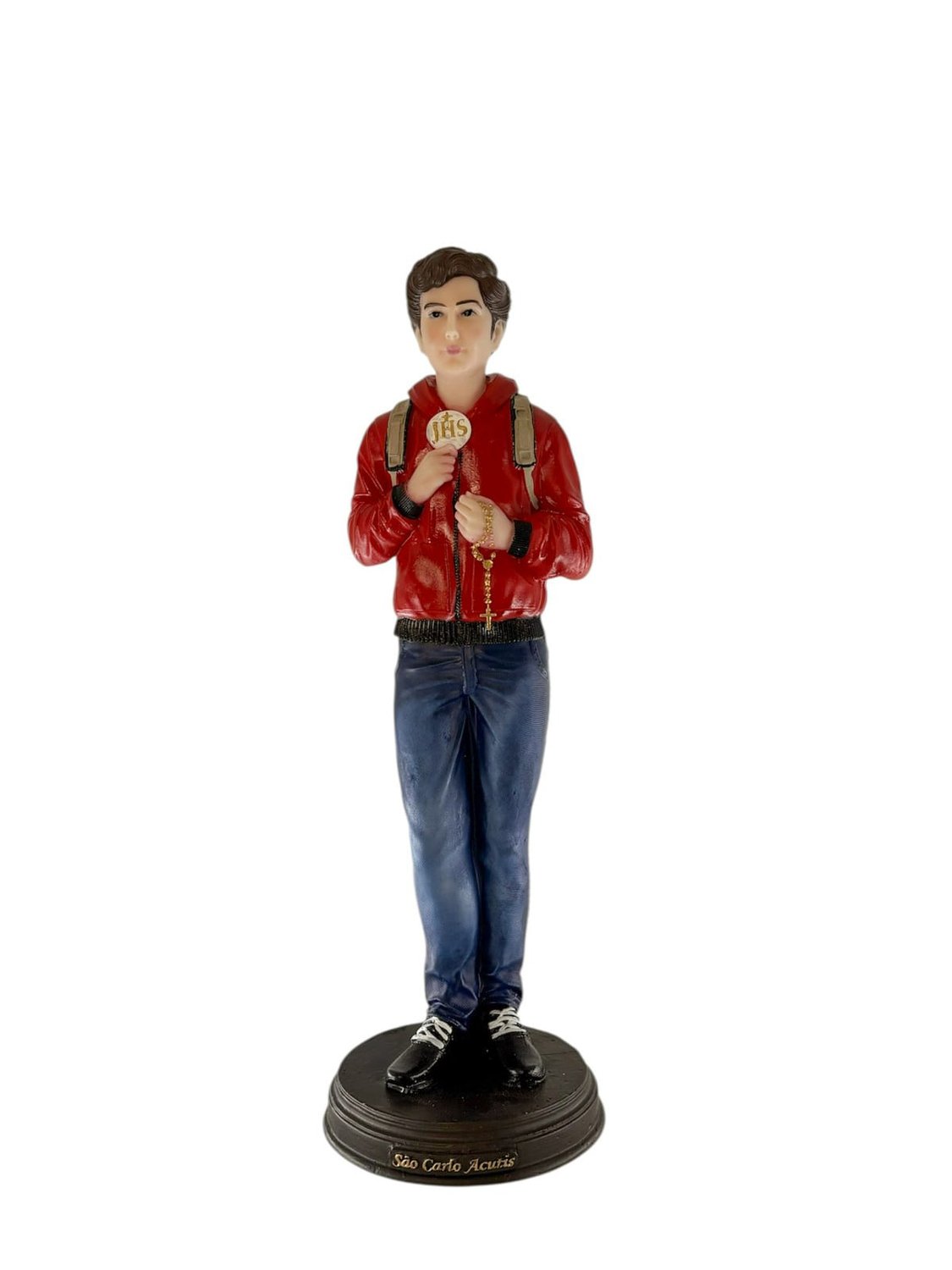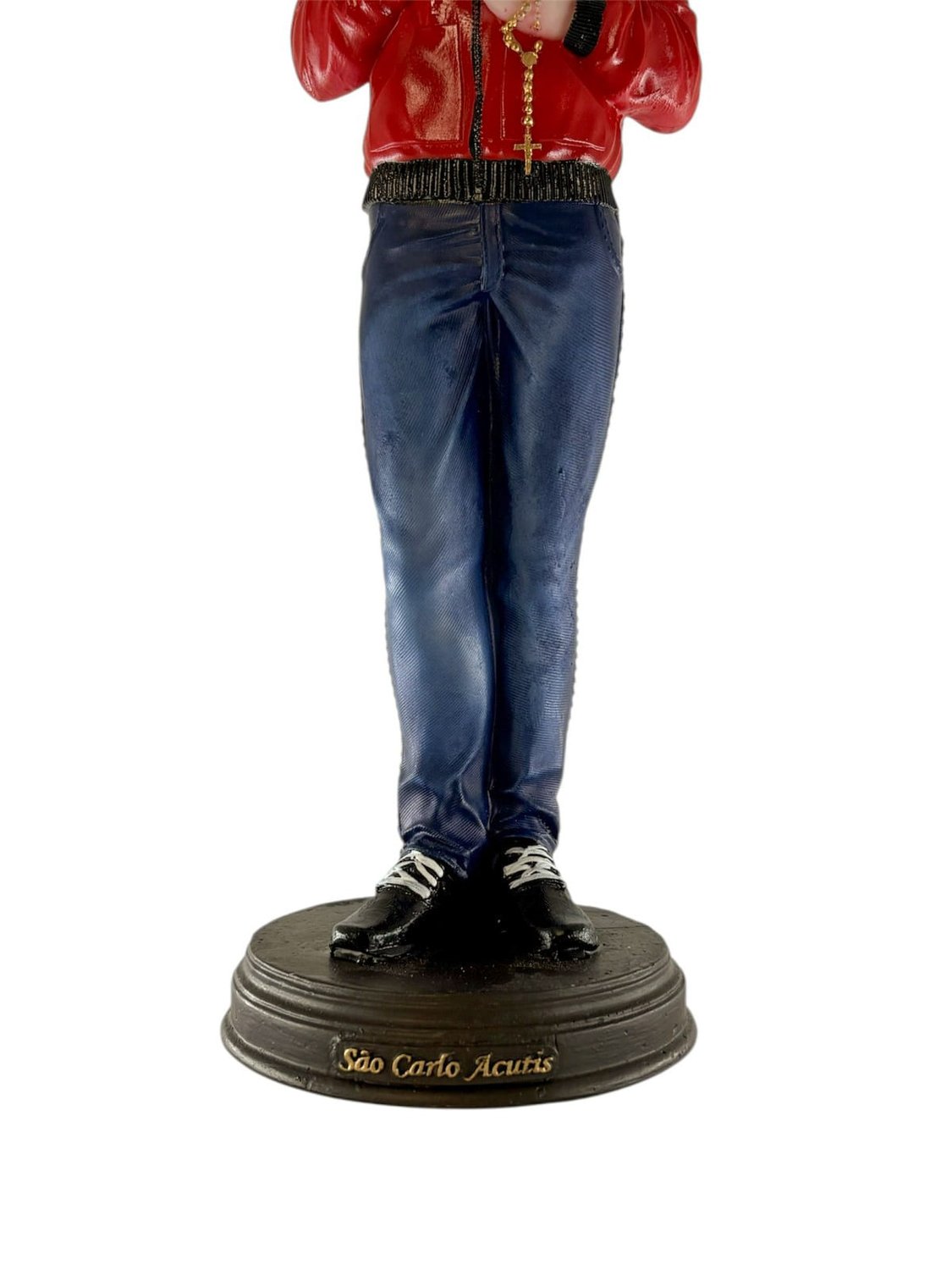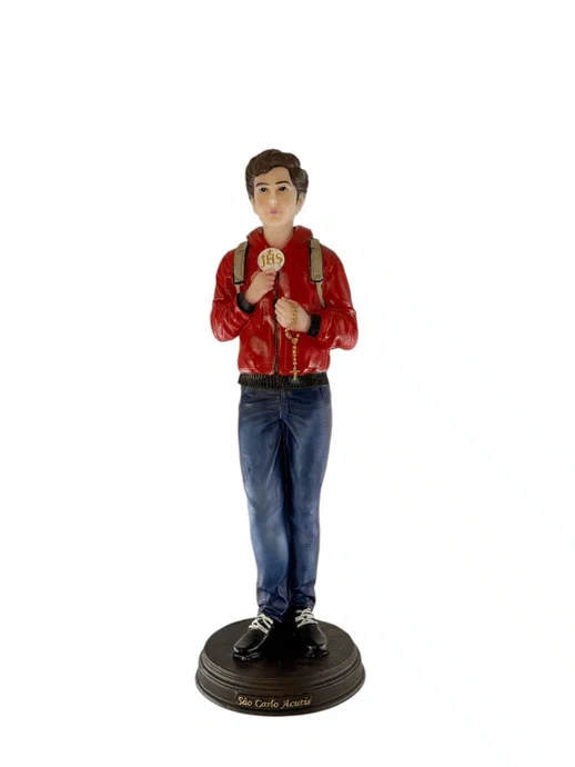 Esta imagem é confeccionada em resina de alta durabilidade, material que permite um nível de detalhamento e realismo superior. Com 30 cm de altura, a peça retrata fielmente a iconografia do "Ciberapóstolo da Eucaristia": o jovem Carlo é representado com suas vestes características (calça jeans e jaqueta vermelha) reforçando sua proximidade com a realidade cotidiana dos fiéis.