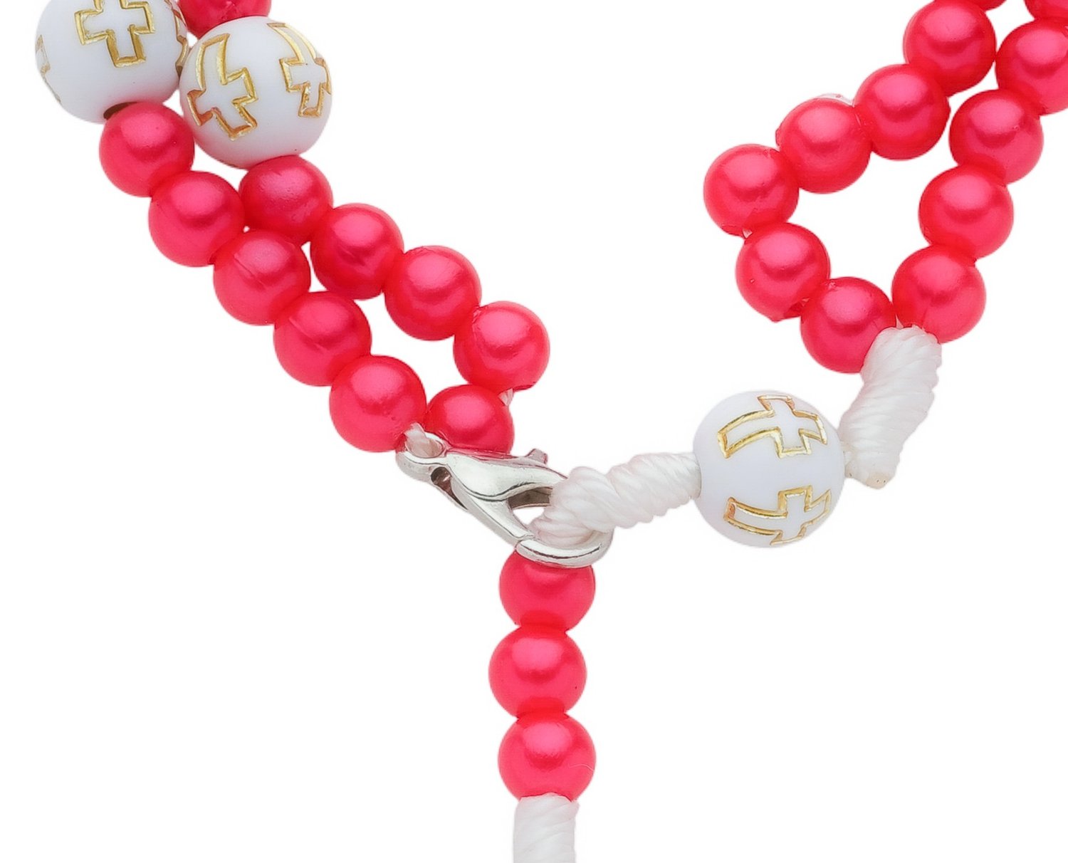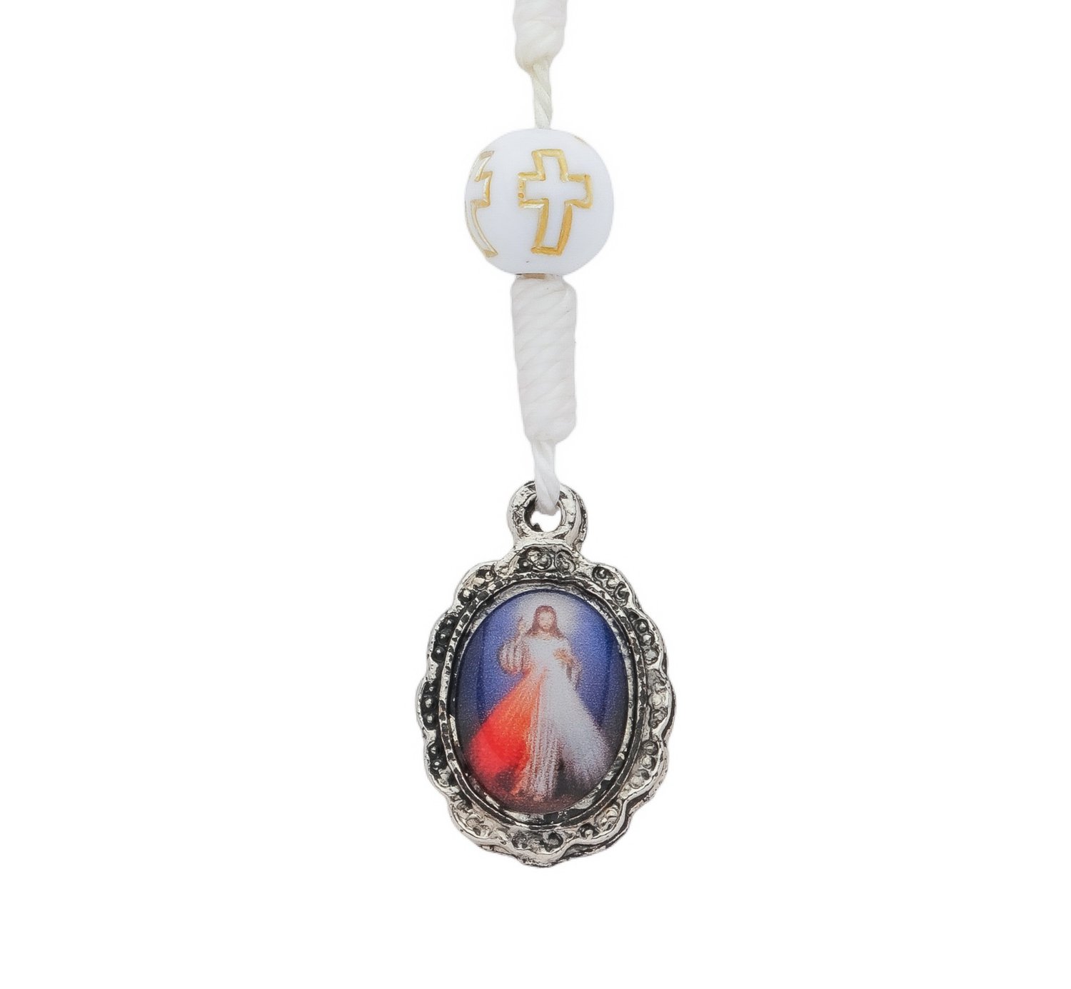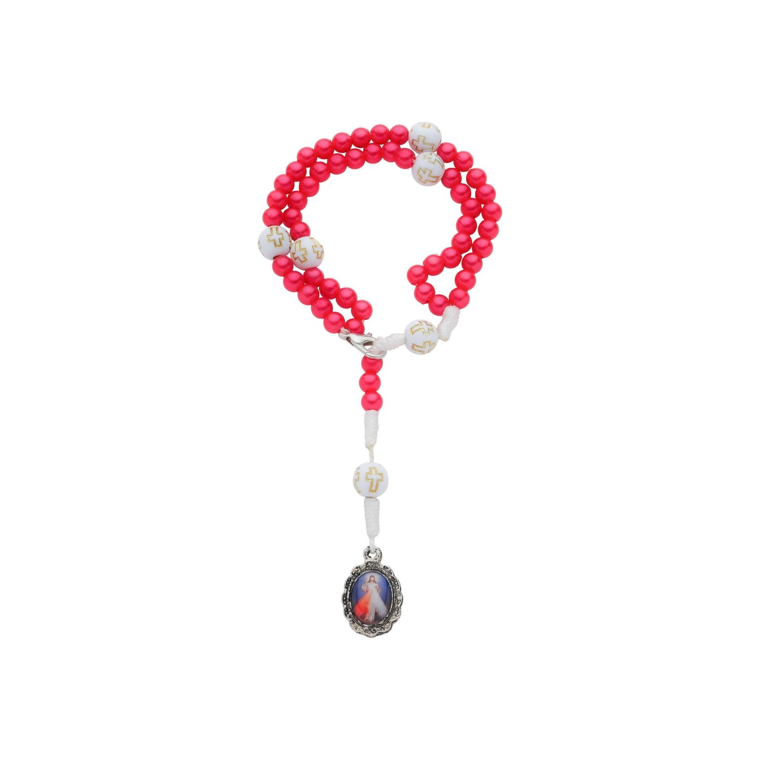 Lindo terço de pulso com imagem Jesus Misericordioso produzido pela Lírio do Vale Artigos Religiosos. Possui contas em pérola metalizada na cor vermelha, entremeio de pérola branca com detalhe em cruz na cor dourada. A medalha é feita de metal prata e tem imagem colorida em resina de Jesus Misericordioso, o que garante maior resistência e durabilidade. O terço é confeccionado com barbante marrom e possui fecho na cor prata. Essa peça tem o certificado de qualidade da Lírio do Vale Artigos Religiosos.