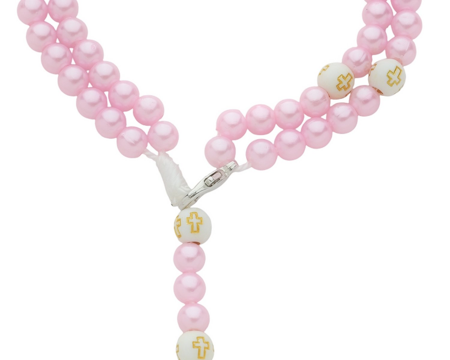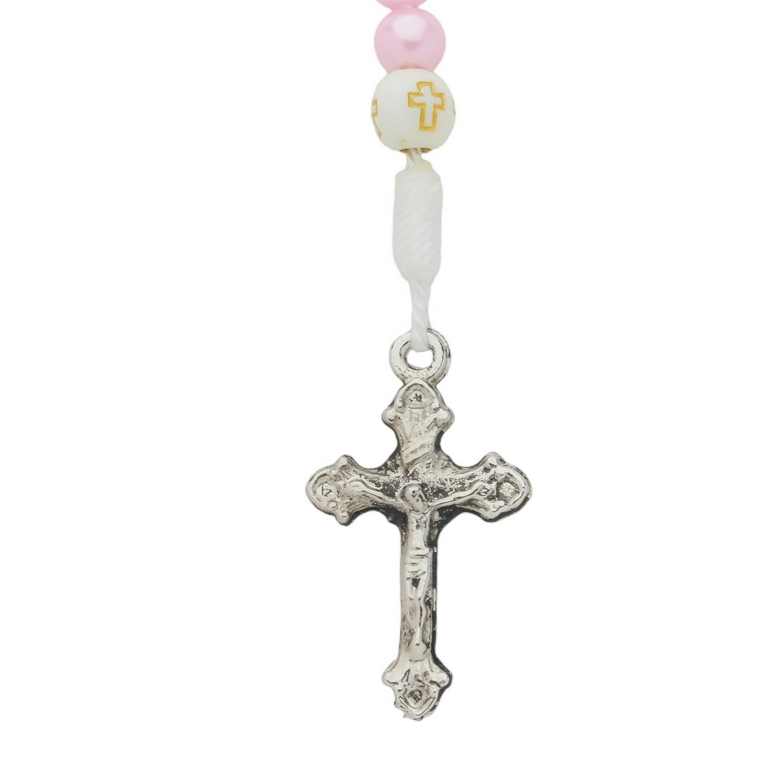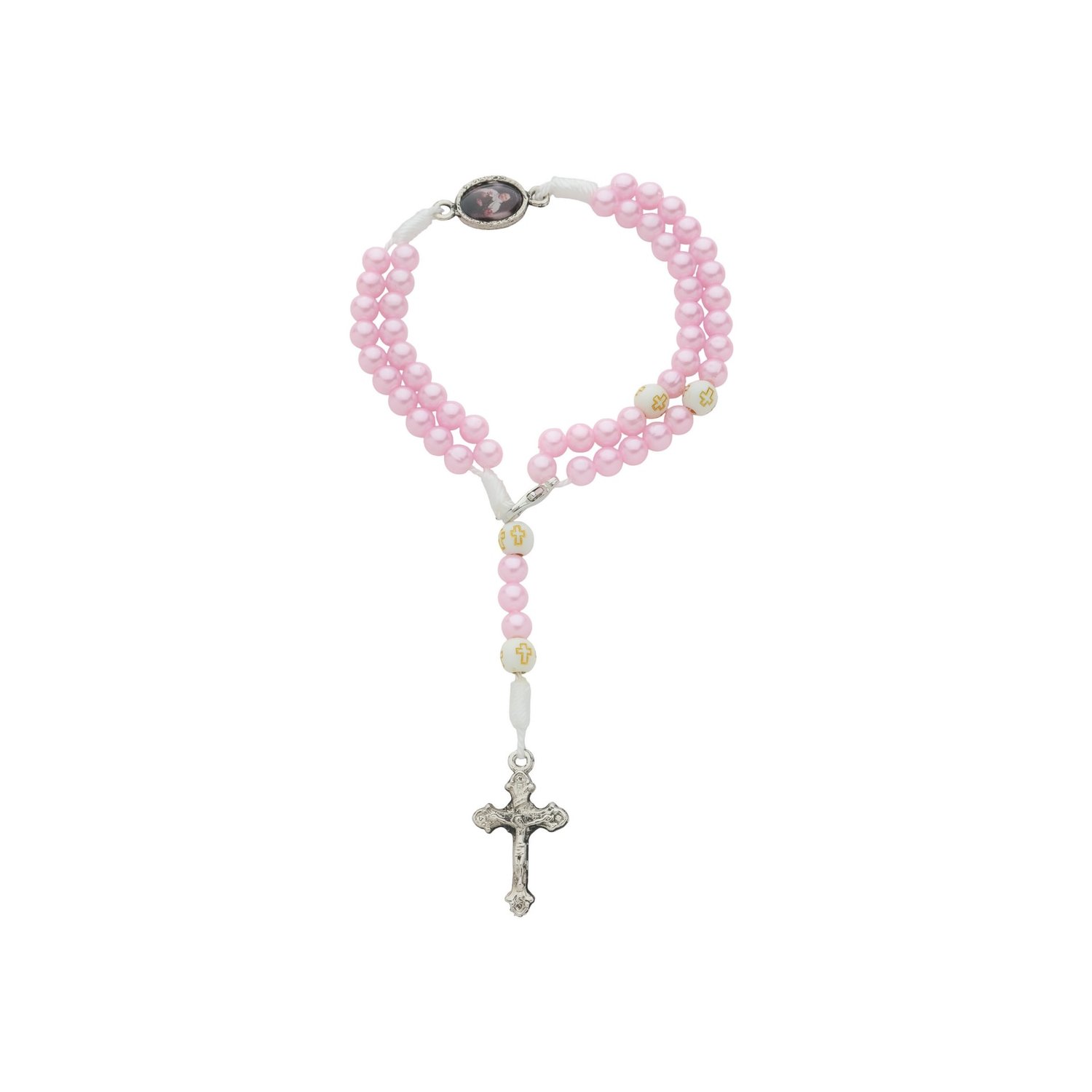 Kit com 3 terços de pulso com conta e entremeio em pérola metalizada na cor rosa claro, medalha em metal prata e imagem colorida em resina de Santa Teresinha, crucifixo na cor prata velha, fecho de metal e barbante na cor branca.