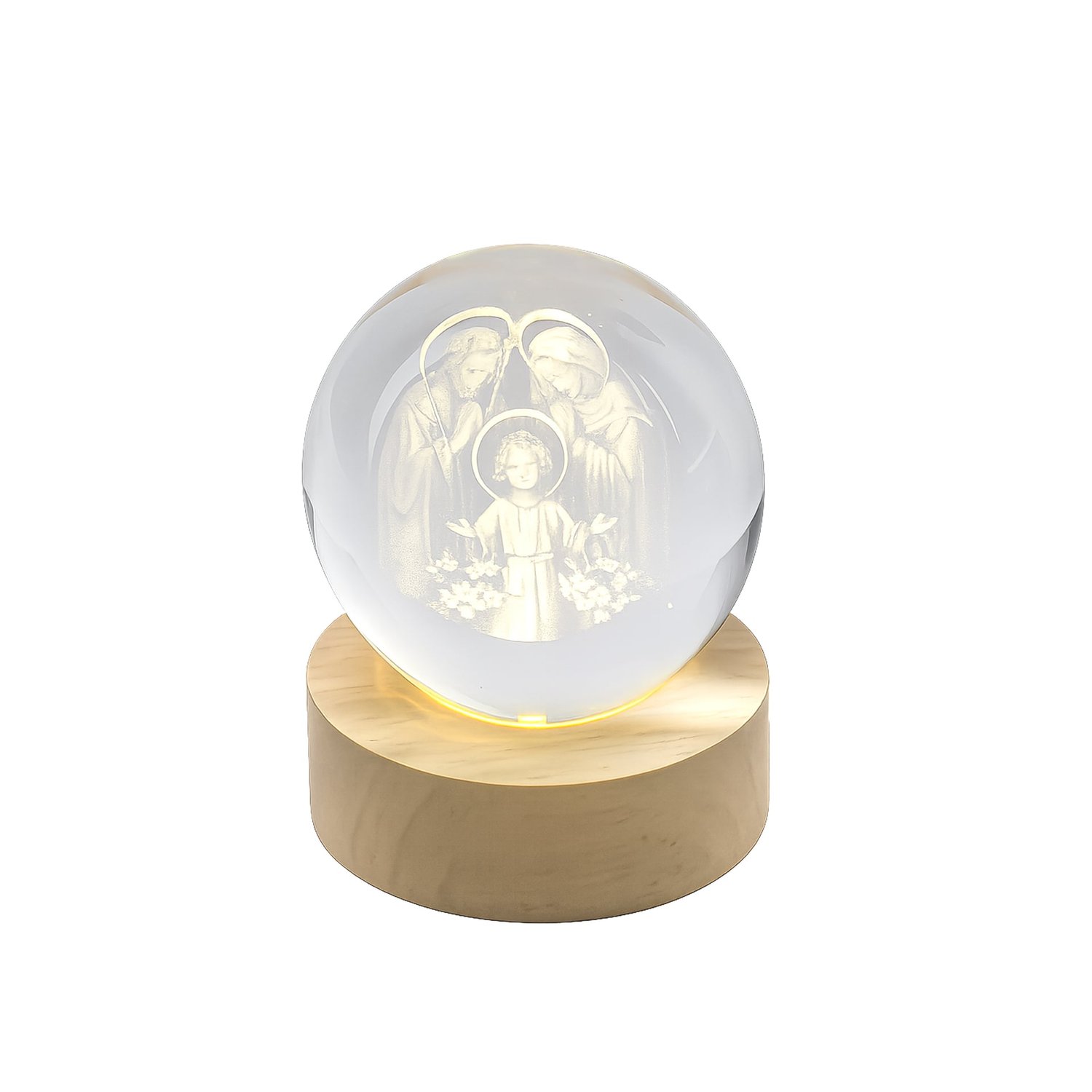 Este artigo decorativo de alto padrão apresenta uma esfera de acrílico cristalino onde a imagem de Jesus, Maria e José é gravada com precisão tecnológica, criando um efeito de impressão em 3D. A imagem parece flutuar dentro da esfera, ganhando vida quando a luz é acionada.