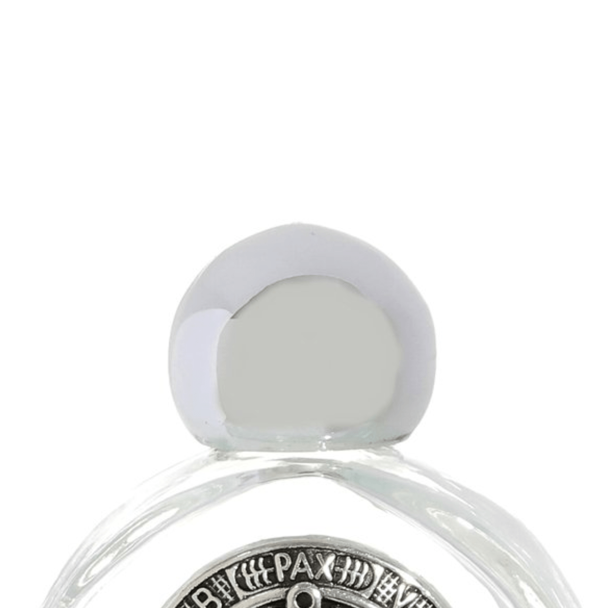 Aproveite aqui para garantir no seu estoque este porta água benta de vidro com Medalha de São Bento em metal prata da Lírio do Vale Distribuidora de Artigos Religiosos!