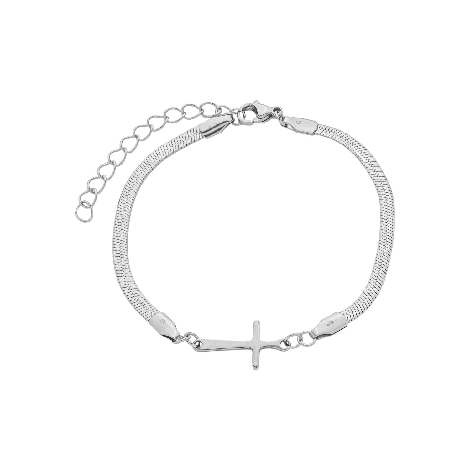 Esta pulseira é fabricada em aço inoxidável de alta qualidade, apresentando a malha serpente (snake), reconhecida por sua estrutura tubular que oferece um caimento sedoso e anatômico ao pulso. O elemento central é um Crucifixo integrado, com acabamento polido de alto brilho.