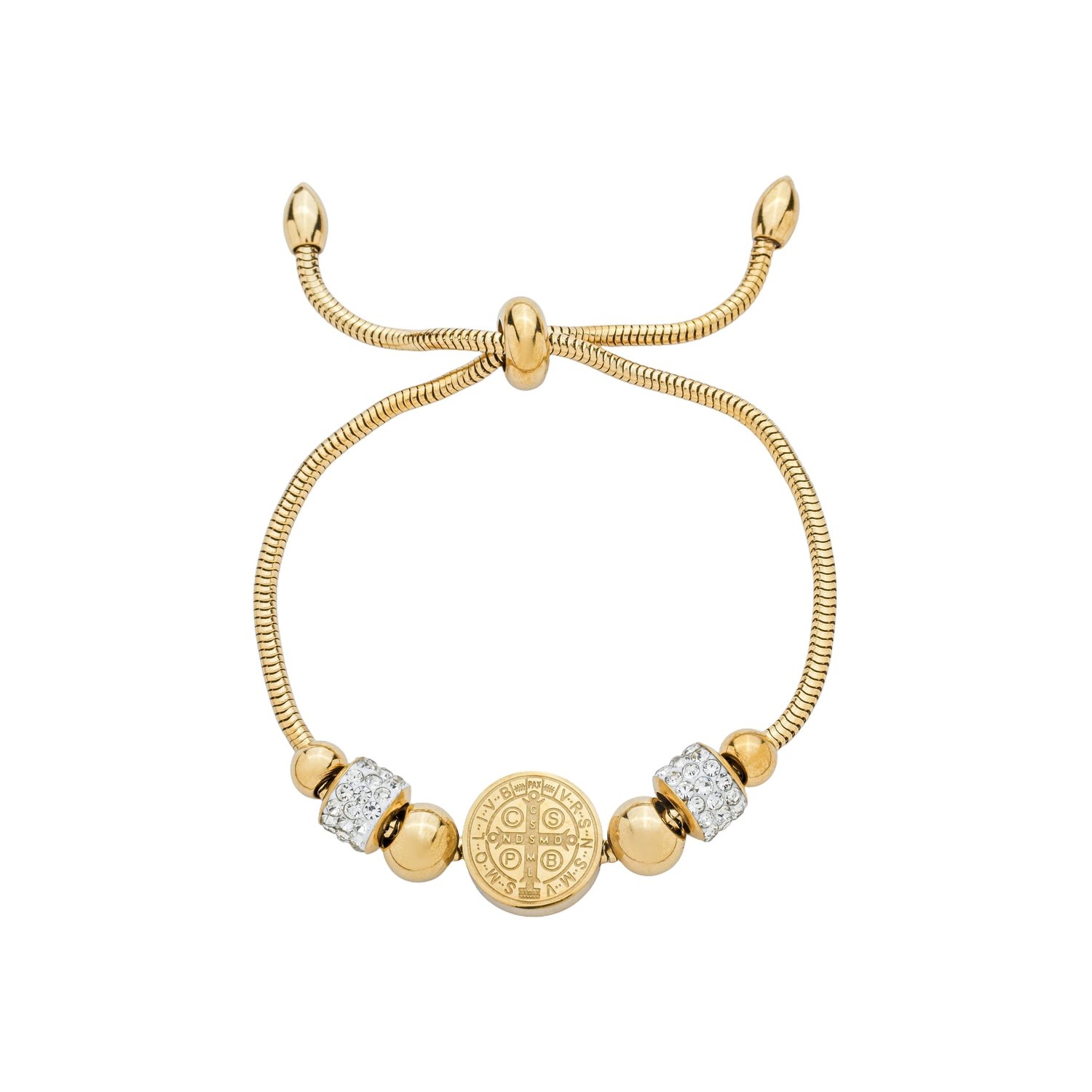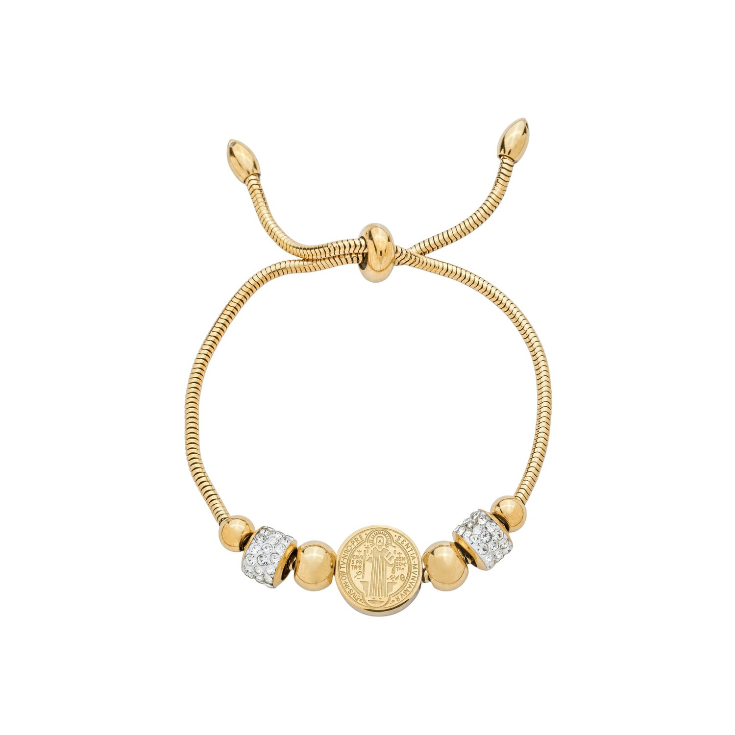Pulseira em Inox Dourada com Berloques e Strass e Pingente da Medalha de São Bento