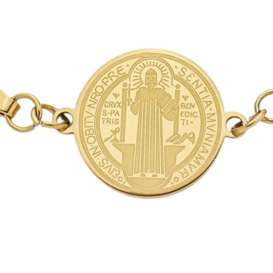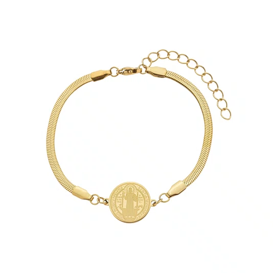 O elemento central é a Medalha de São Bento, apresentada com acabamento polido e detalhes nítidos da cruz e das orações de proteção. A combinação do tom dourado com a malha tubular confere à peça um ar de joia clássica, perfeita para clientes exigentes que buscam elegância e proteção em um único acessório.