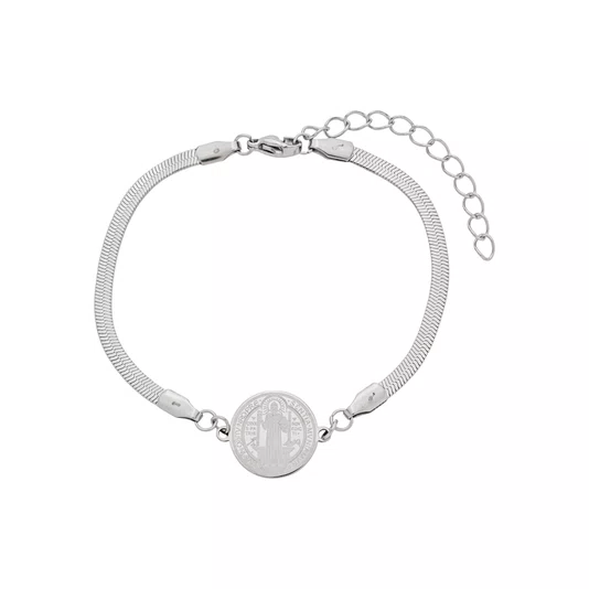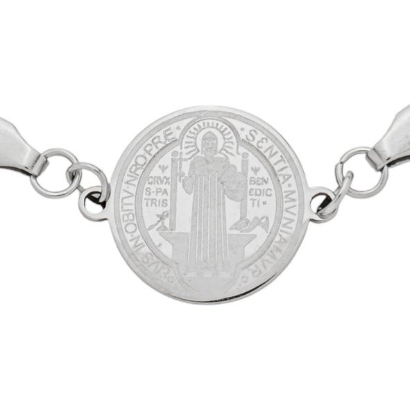 O ponto focal da peça é a Medalha de São Bento, integrada ao design com acabamento polido. A medalha traz os símbolos sagrados de proteção e exorcismo, conferindo à peça um valor espiritual profundo em um formato discreto. Por ser em inox, a pulseira é hipoalergênica, não oxida, não escurece e possui uma dureza que evita riscos e deformações.