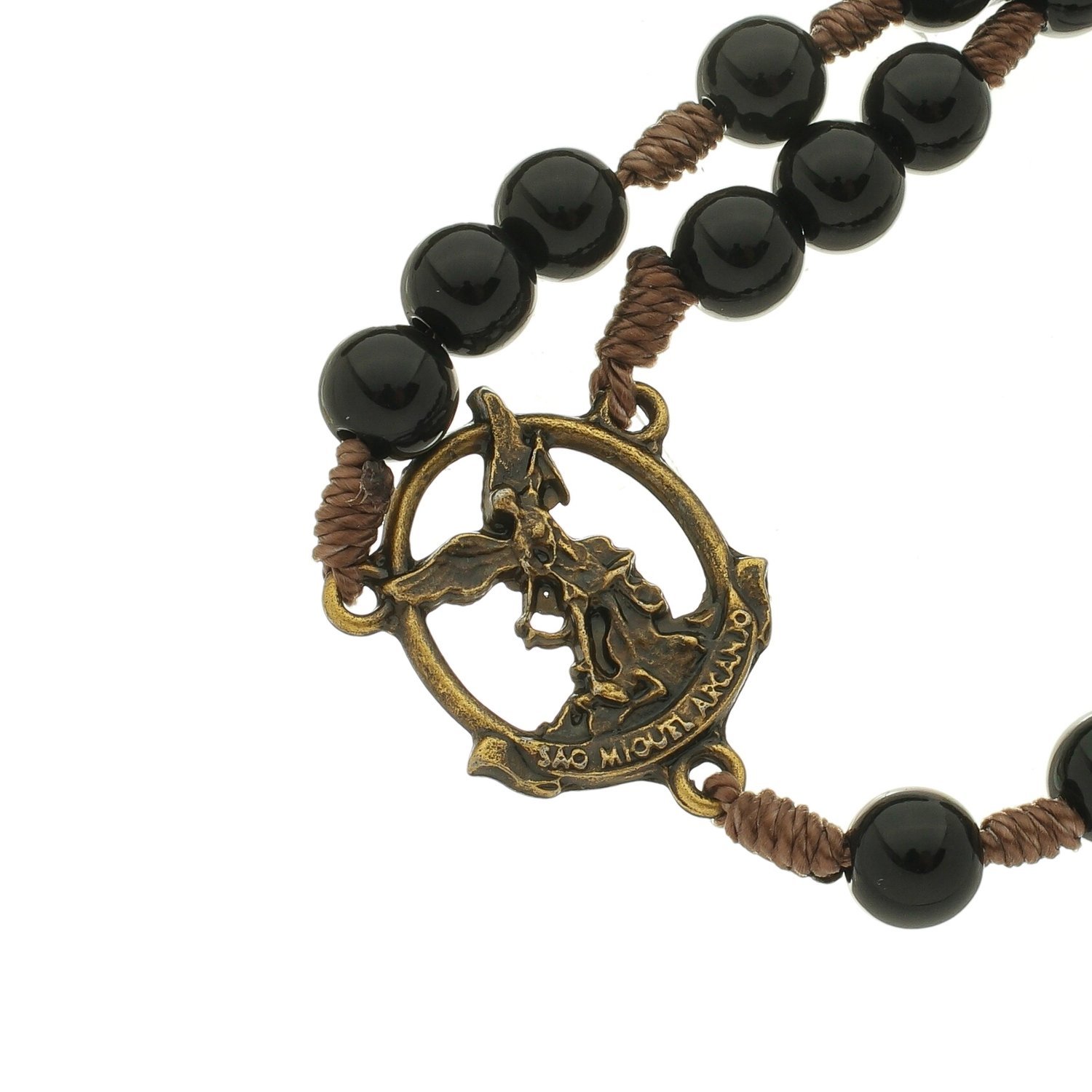 Em devoção ao poderoso São Miguel Arcanjo e com confiança em sua proteção, a Lírio do Vale Artigos Religiosos apresenta este belo terço! Com 40 contas pérolas na cor preta, a peça oferece um design clássico. O barbante marrom escuro traz consigo a medalha vazada do Santo Arcanjo Guerreiro e na sua extremidade a sua espada, ambos na cor de ouro envelhecido.