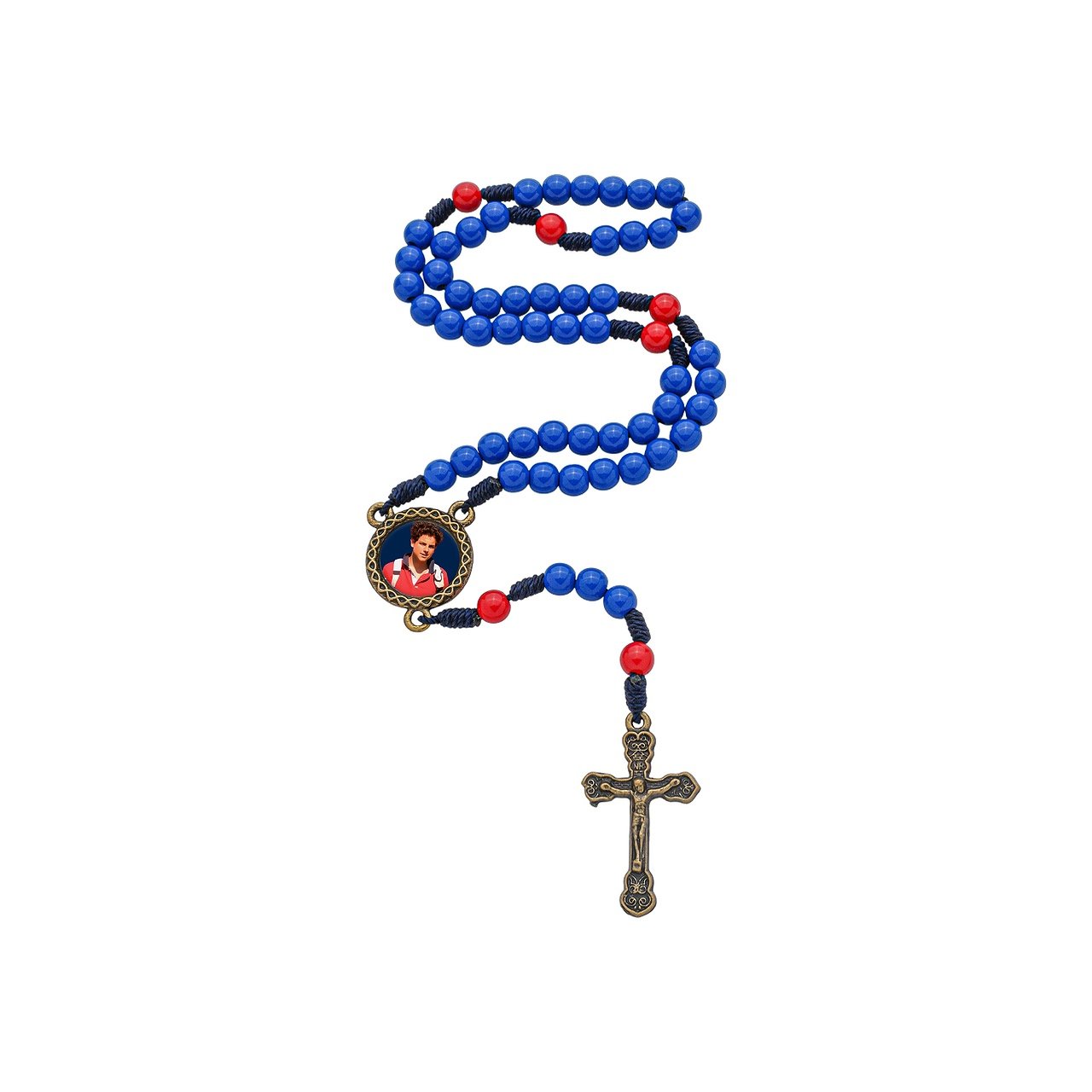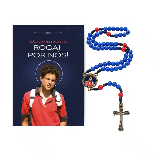 O terço é produzido com contas de pérola ABS de 6mm, apresentando uma composição de cores simbólica: o azul predominante remete à serenidade e à devoção mariana de Carlo, enquanto as contas vermelhas do "Pai Nosso" destacam o dinamismo e o amor à Eucaristia, que ele chamava de sua "rodovia para o céu". O produto é acompanhado por um folheto exclusivo com a oração oficial em devoção ao santo, que agrega valor pedagógico e devocional, tornando-o uma solução completa para o consumidor final.