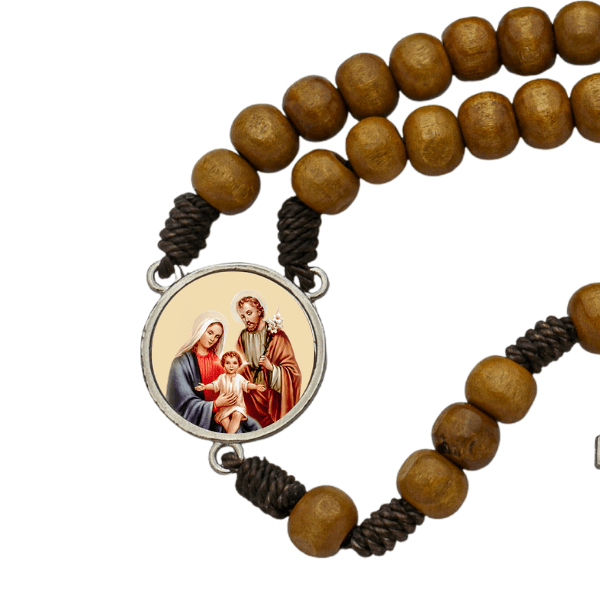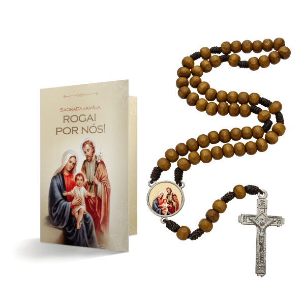 Terço Sagrada Família com Folheto Devocional | Madeira Marrom Claro 8mm