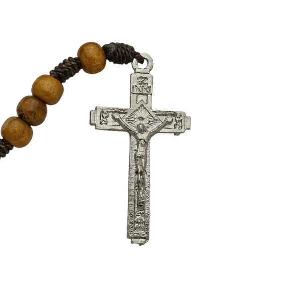 Crucifixo e Montagem de Qualidade: Finalizado com um crucifixo prateado rico em detalhes e montado em cordão marrom de alta resistência, garantindo que o terço suporte o uso constante em orações comunitárias ou individuais.