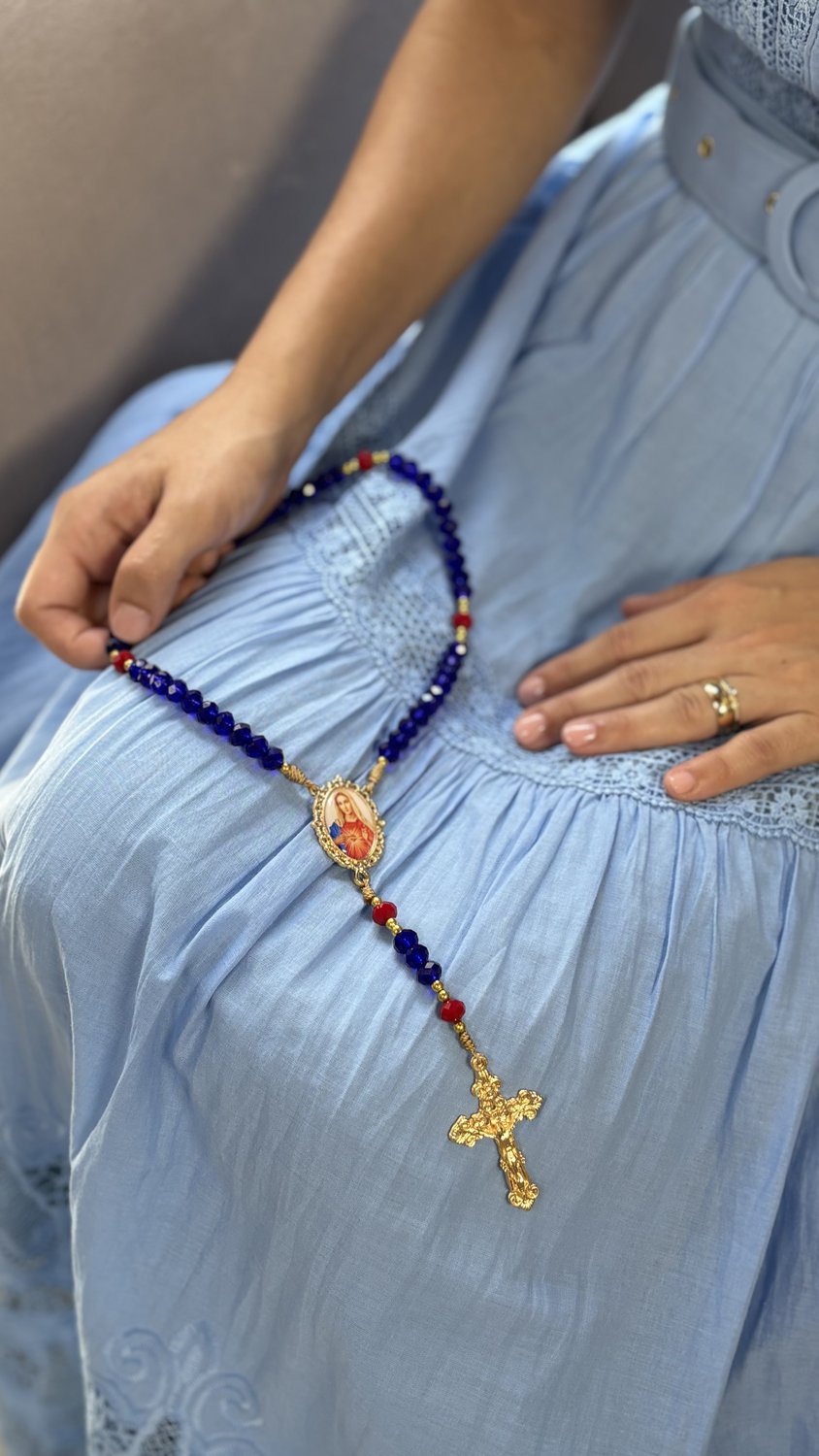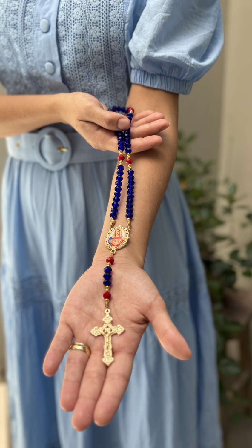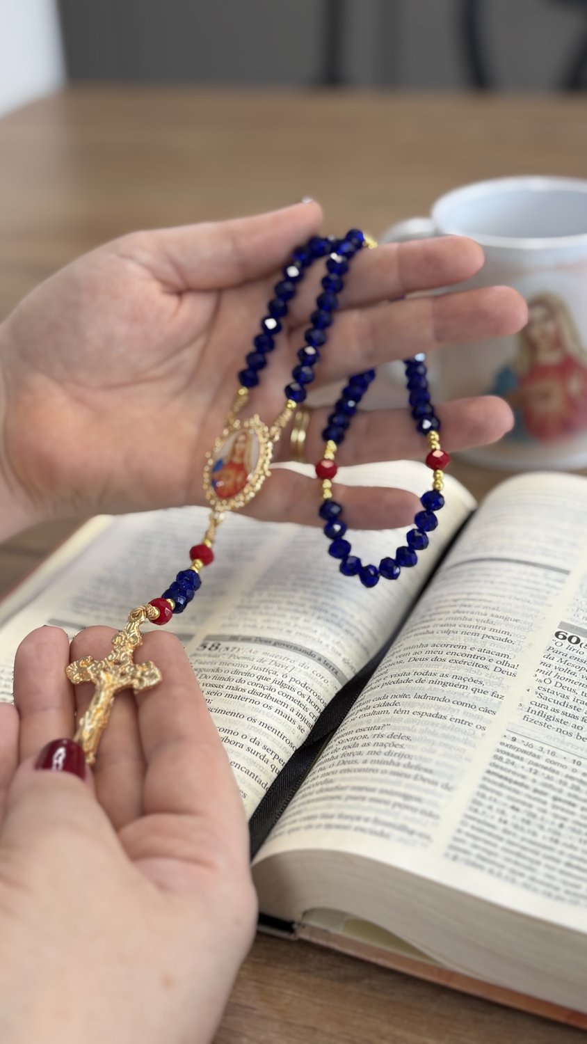Paleta de Cores Sofisticada: As contas das Ave-Marias em tom azul trazem uma sobriedade clássica, enquanto os Pai-Nossos em vermelho destacam a realeza e o manto celestial da Virgem, criando uma harmonia perfeita com a estampa do Imaculado Coração.
