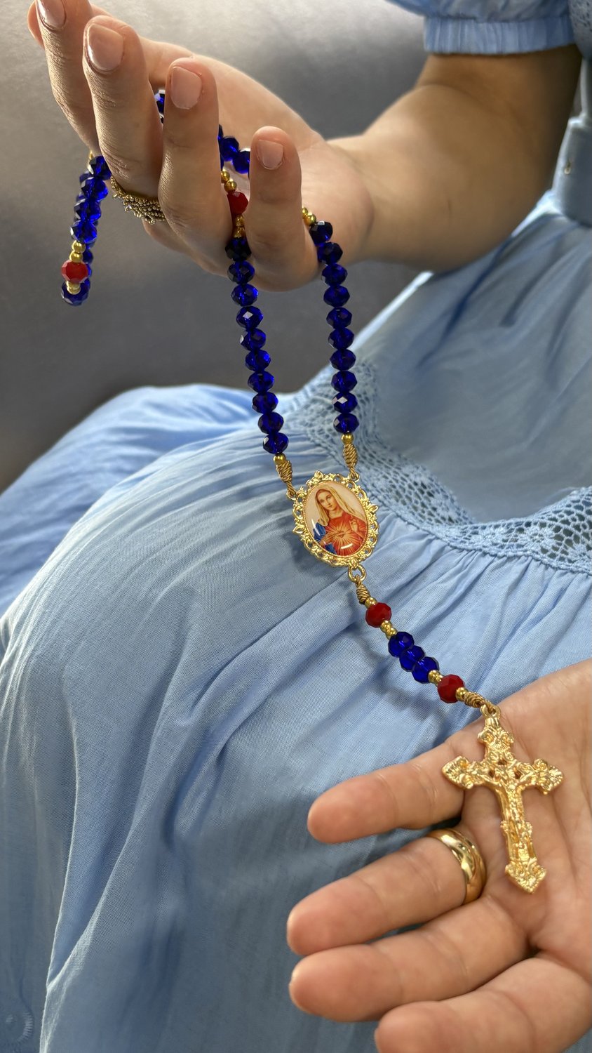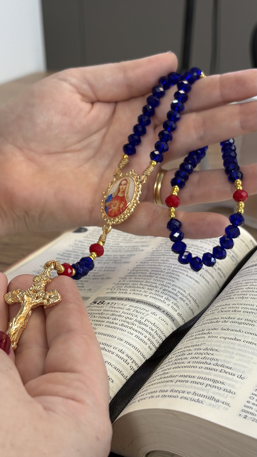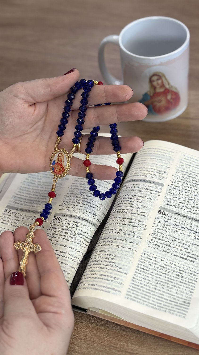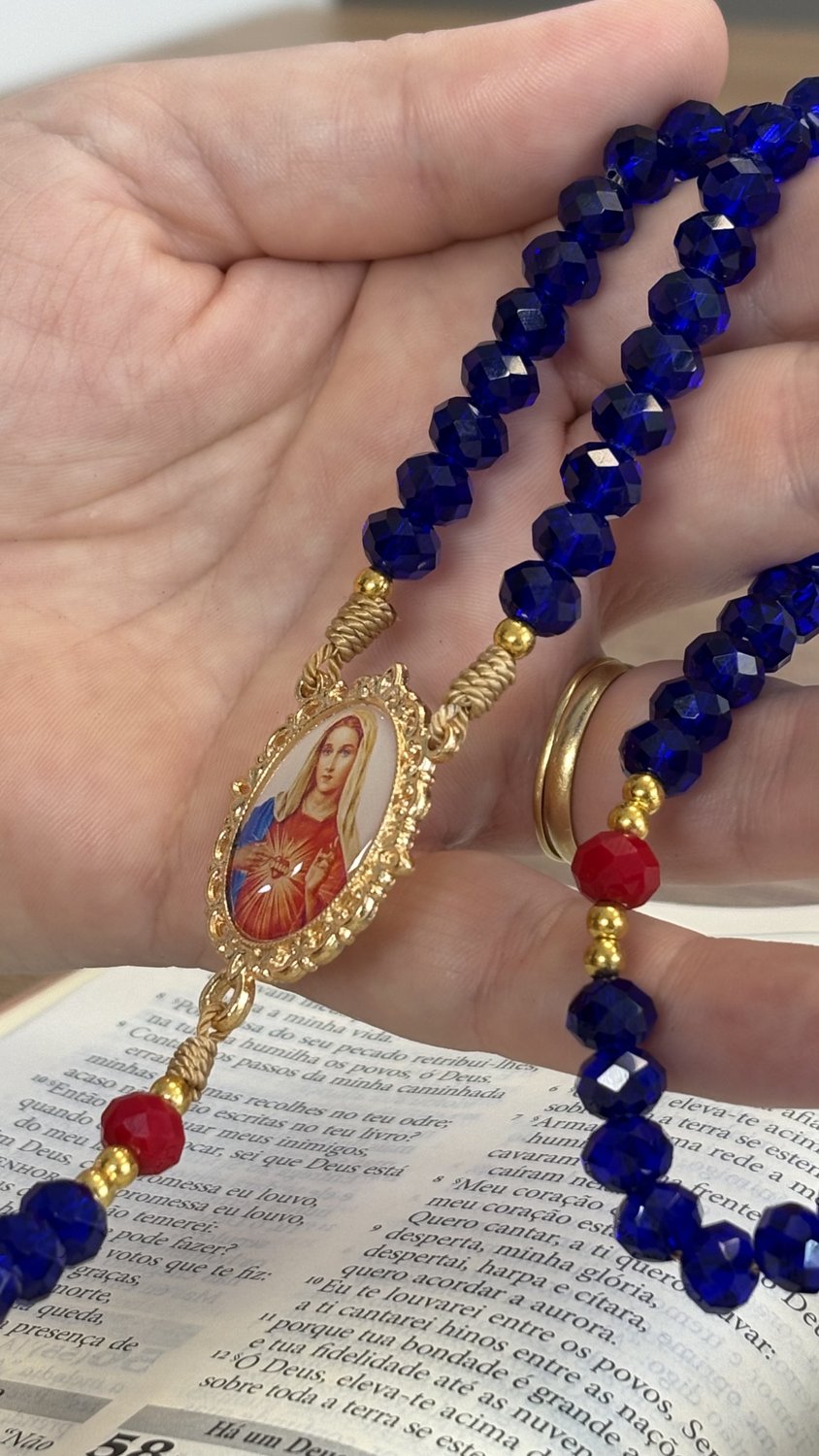 Paleta de Cores Sofisticada: As contas das Ave-Marias em tom azul trazem uma sobriedade clássica, enquanto os Pai-Nossos em vermelho destacam a realeza e o manto celestial da Virgem, criando uma harmonia perfeita com a estampa do Imaculado Coração.