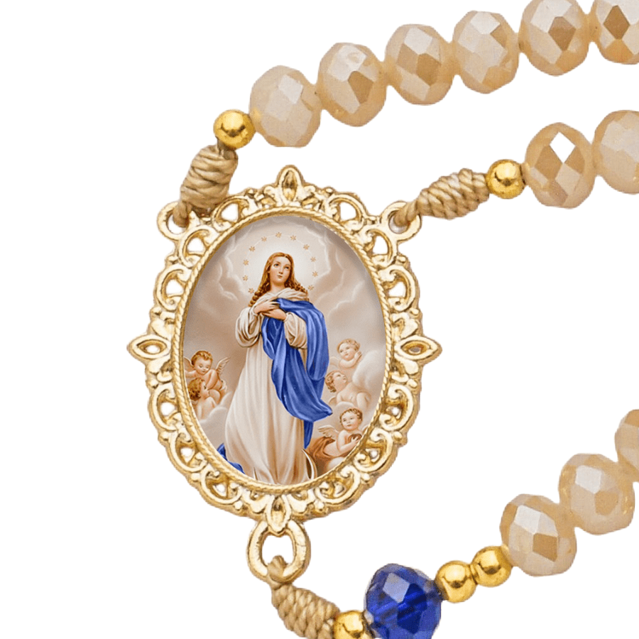 Paleta de Cores Elegante: As contas das Ave-Marias em tom doce de leite proporcionam uma base clássica e suave, enquanto os Pai-Nossos em azul evocam o manto celestial da Virgem, criando um contraste sofisticado e cheio de significado.