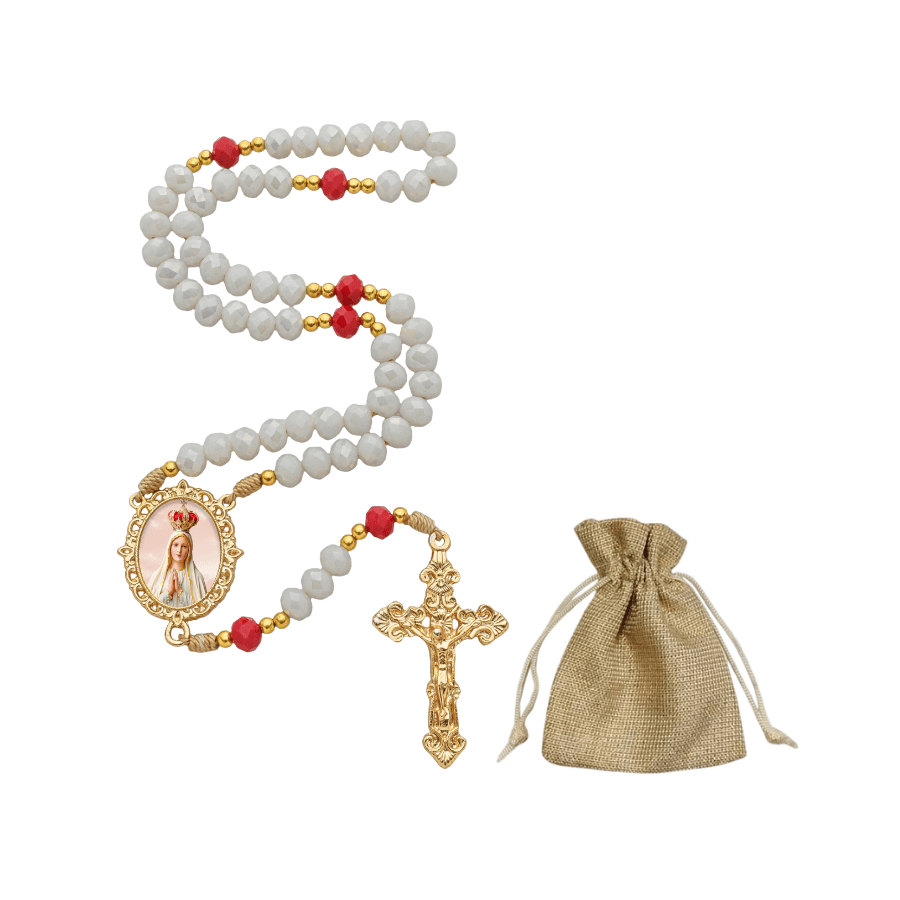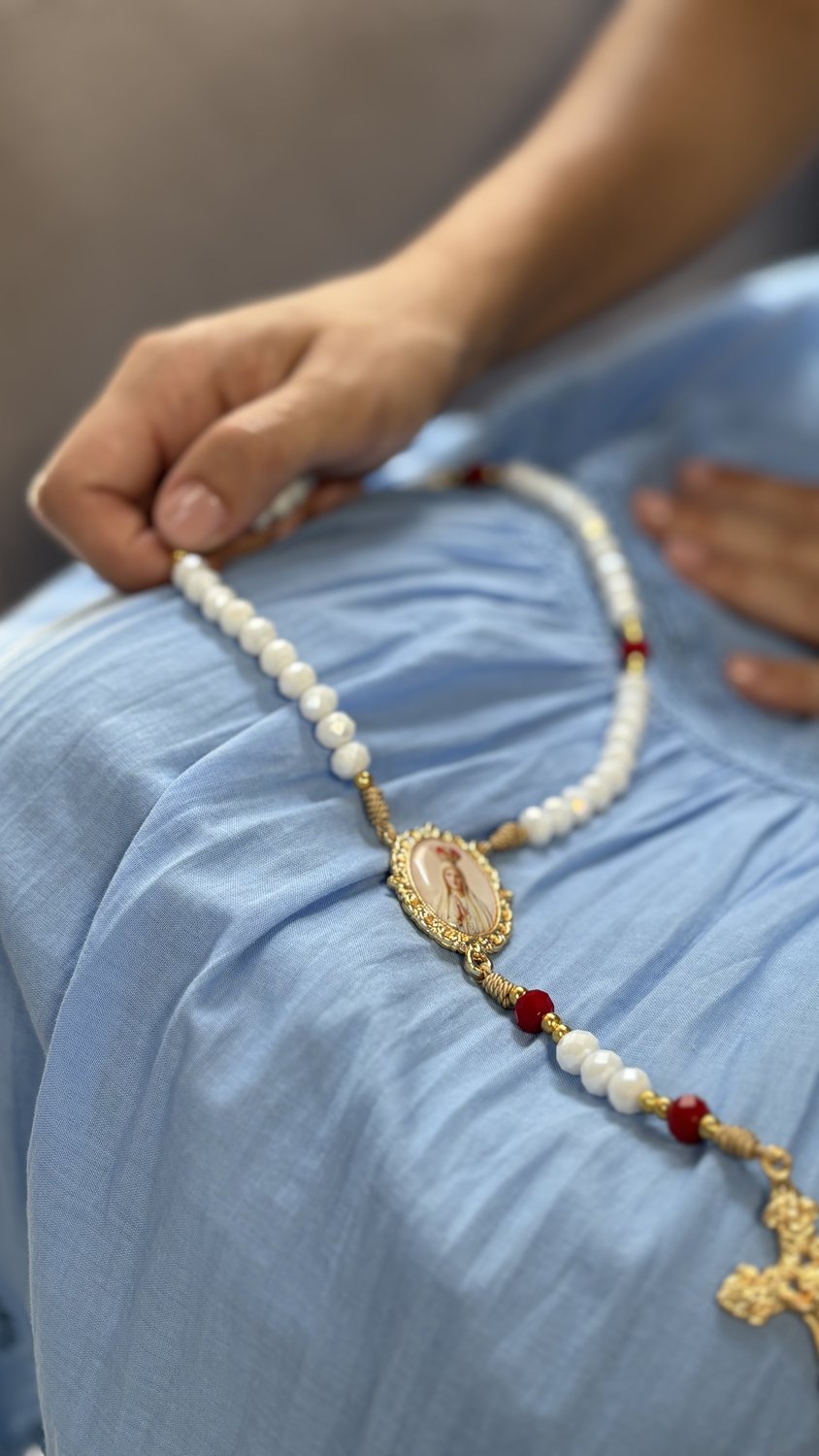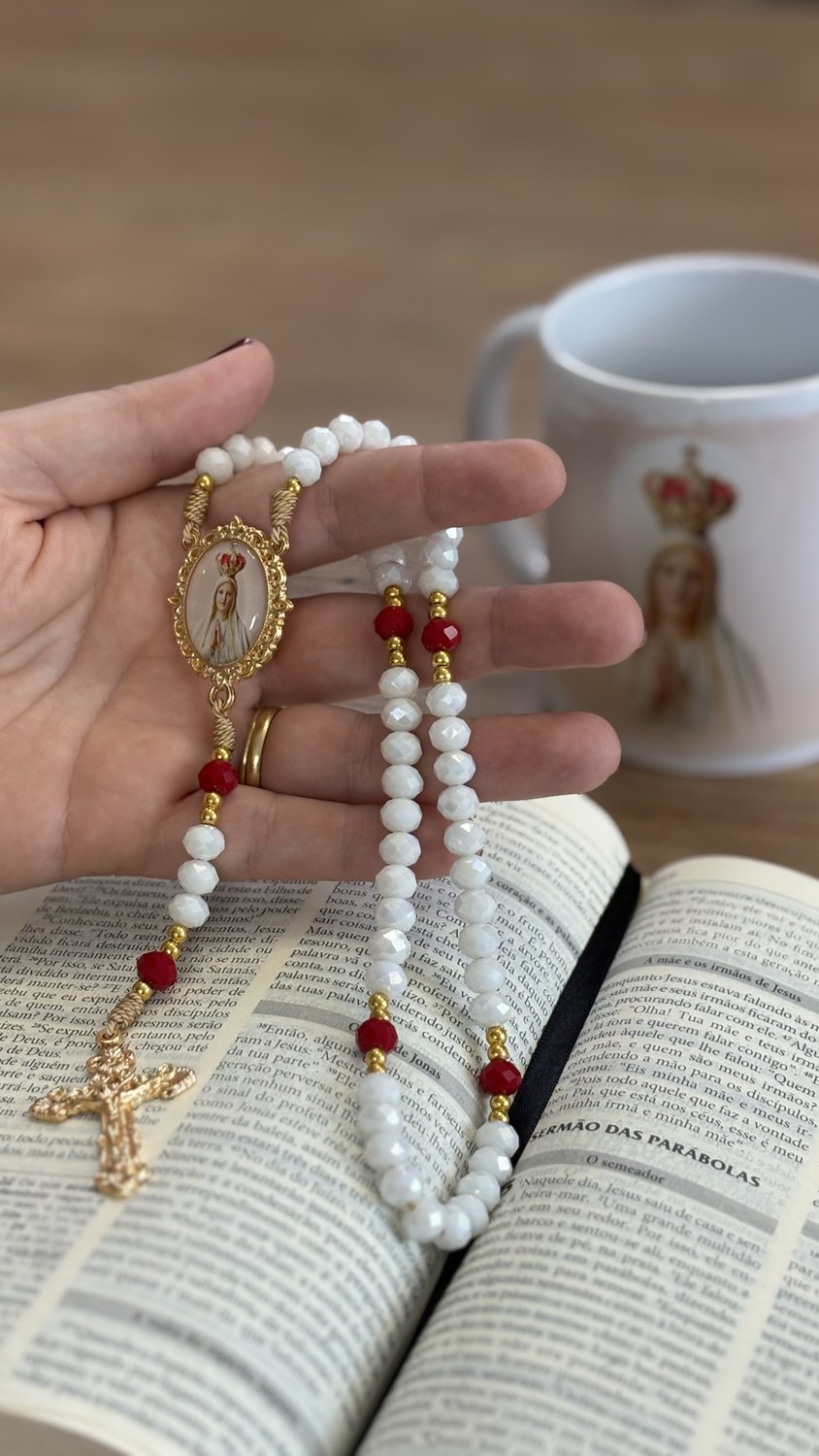 Paleta de Cores Clássica: As contas das Ave-Marias em branco translúcido simbolizam a pureza e a luz da aparição, enquanto os Pai-Nossos em vermelho trazem um contraste vibrante e solene, harmonizando perfeitamente com a estampa de Nossa Senhora de Fátima.