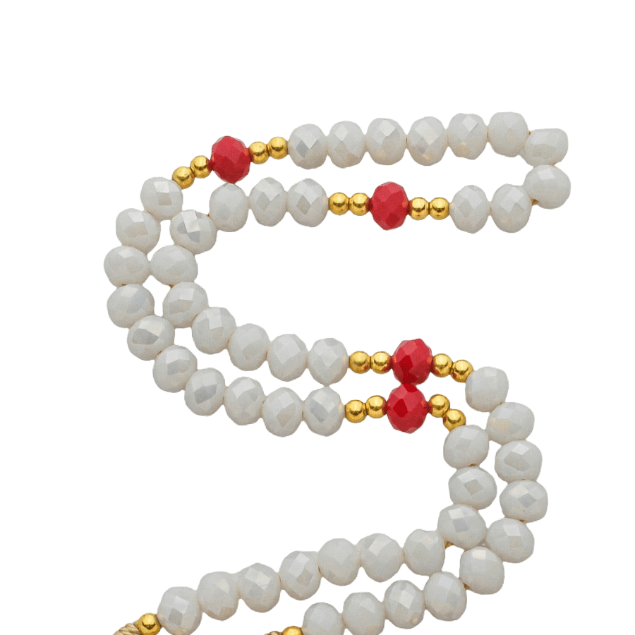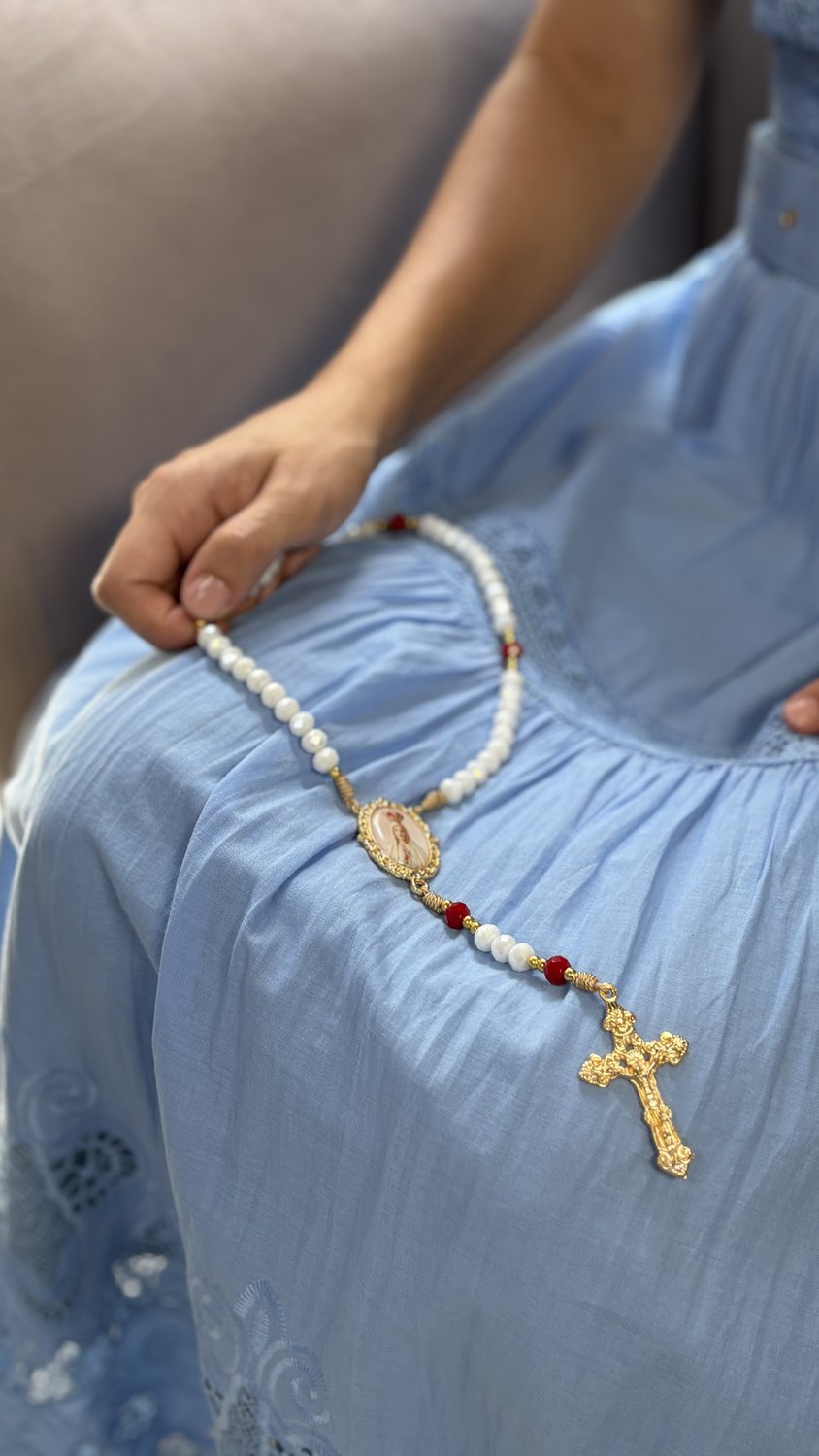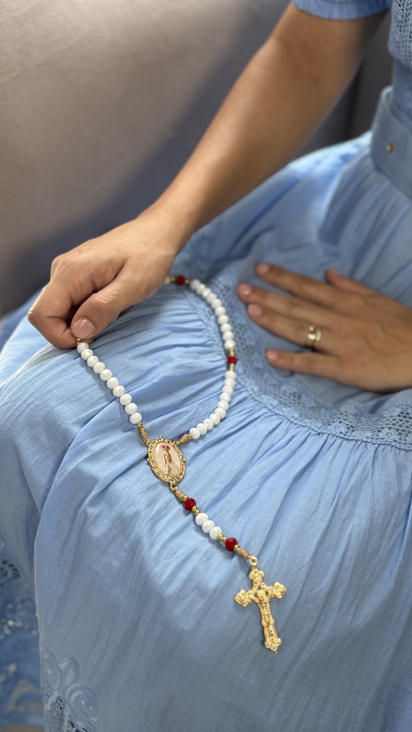 Paleta de Cores Clássica: As contas das Ave-Marias em branco translúcido simbolizam a pureza e a luz da aparição, enquanto os Pai-Nossos em vermelho trazem um contraste vibrante e solene, harmonizando perfeitamente com a estampa de Nossa Senhora de Fátima.
