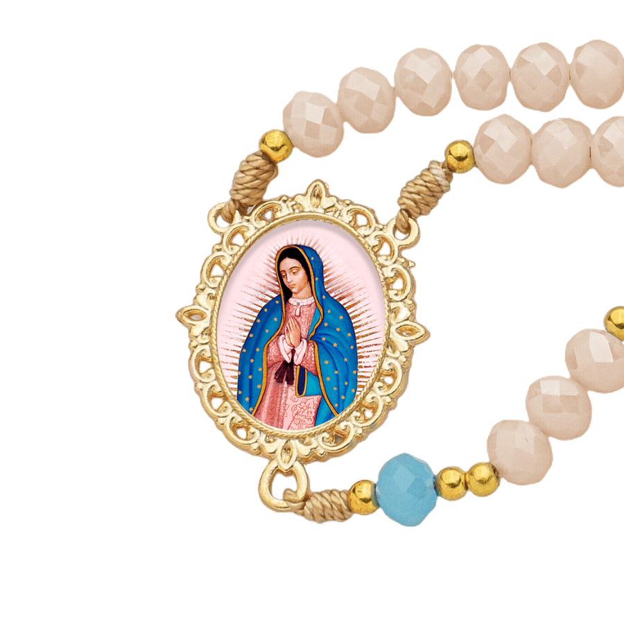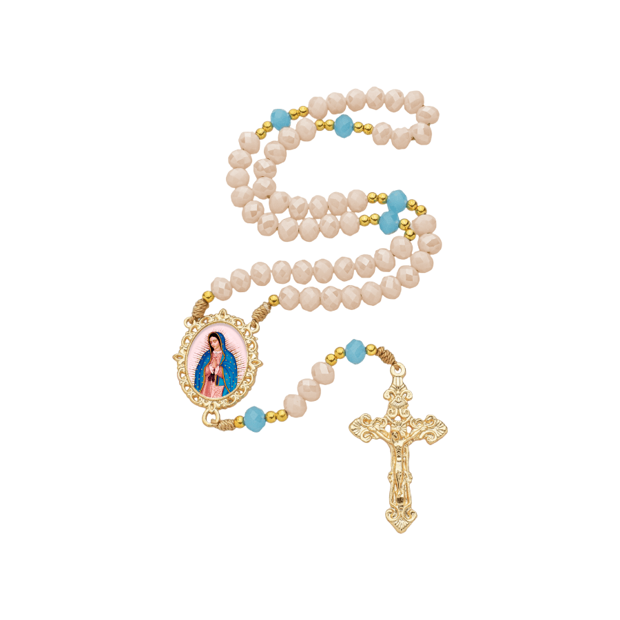 Terço Cristal Luxo Nossa Senhora de Guadalupe com Saquinho de Juta Dourado