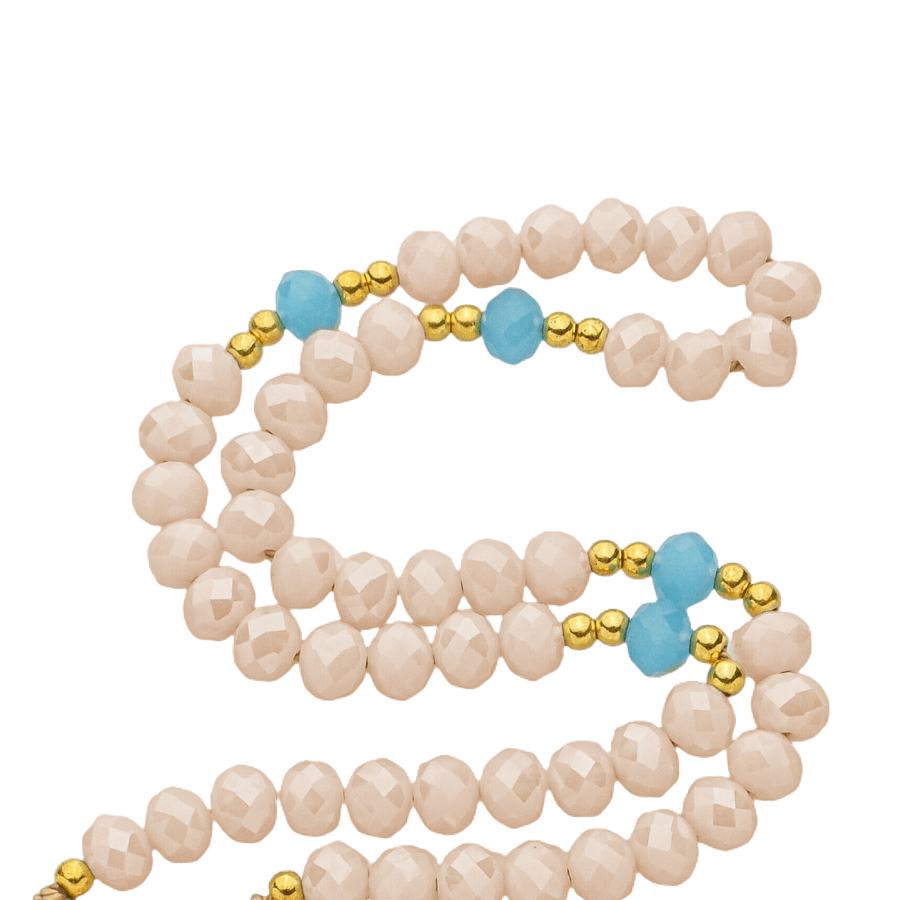 Paleta de Cores Clássica: As contas das Ave-Marias em rosê translúcido simbolizam a pureza, enquanto os Pai-Nossos em tom azul exaltam o manto estrelado da Virgem, criando uma composição harmônica e elegante.