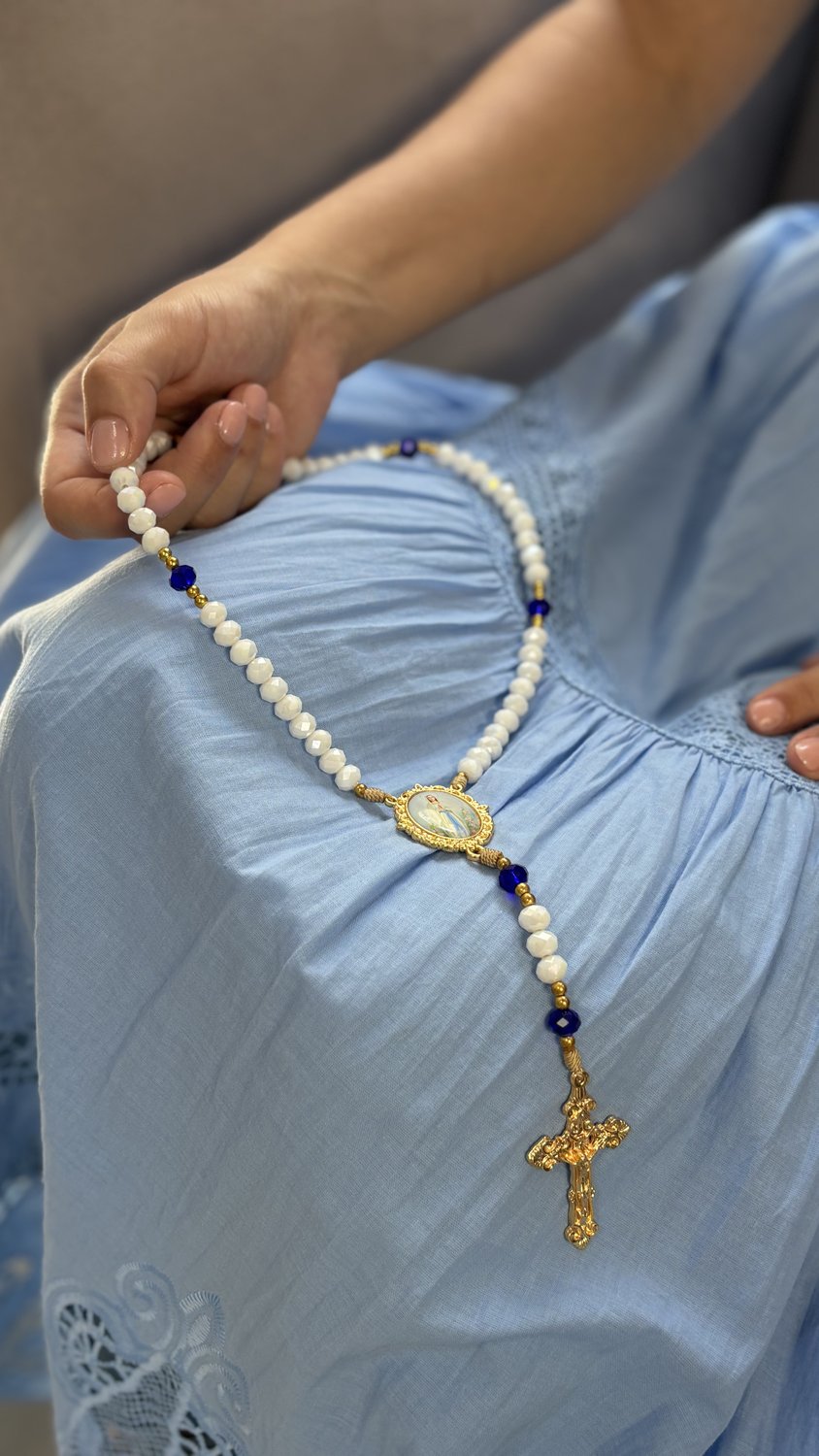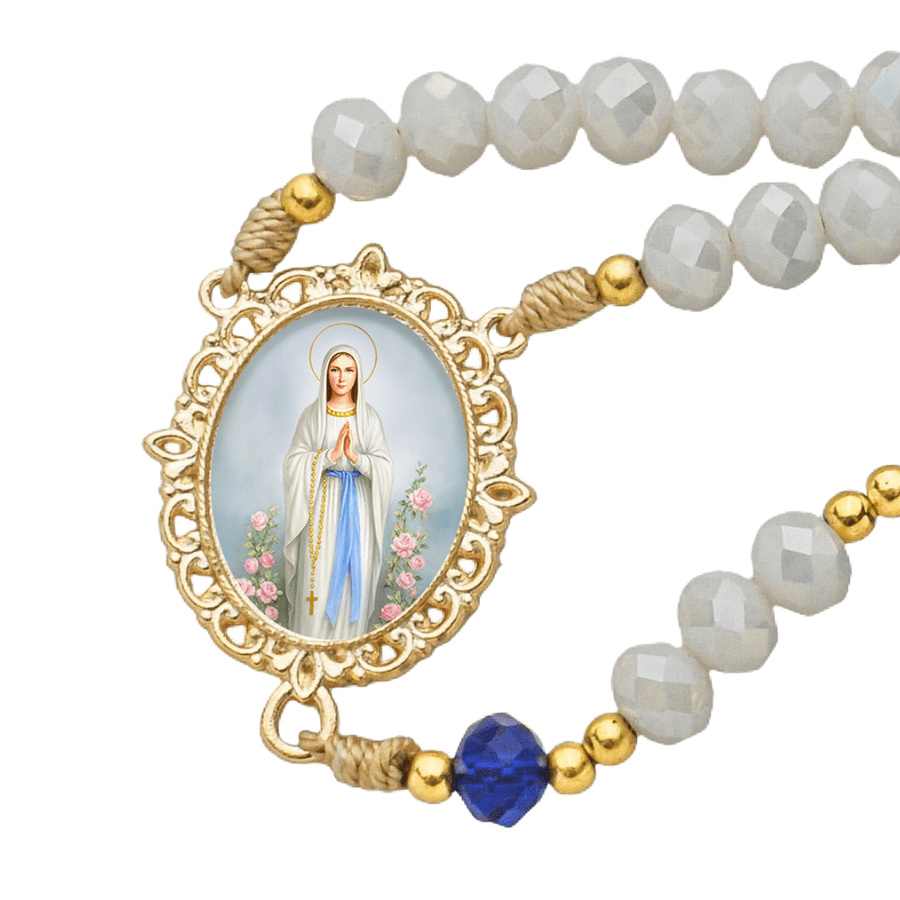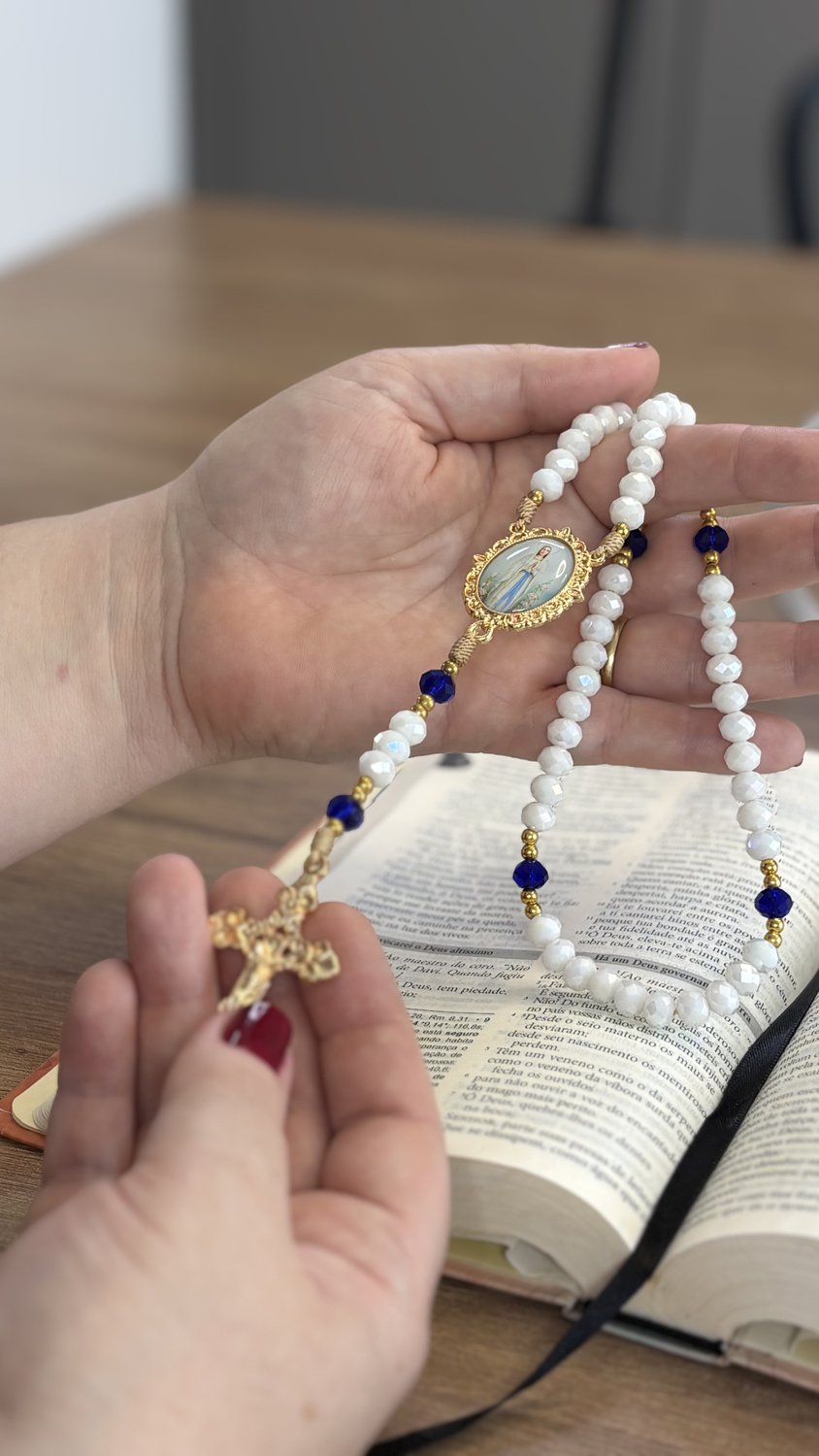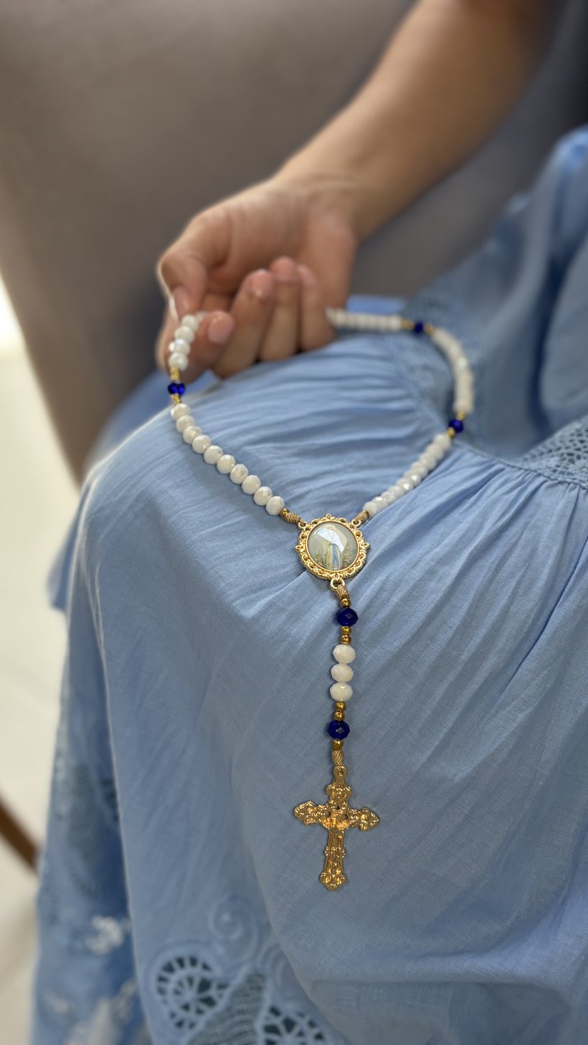 Contas de Cristal: As contas em cristal lapidado apresentam tonalidades translúcidas e suaves que harmonizam com a estética de Nossa Senhora de Lourdes (azul e branco), captando a luz de forma sublime.