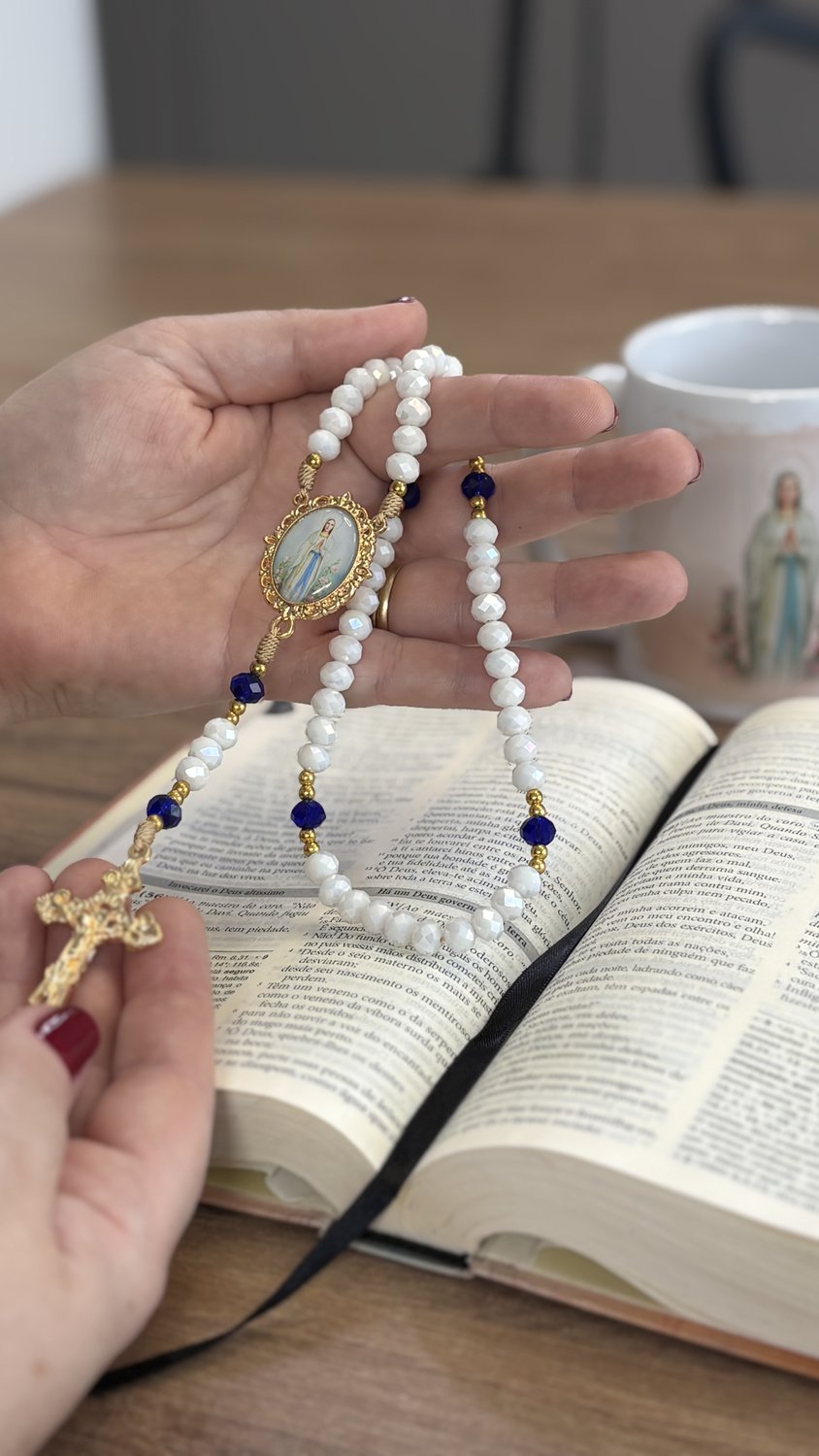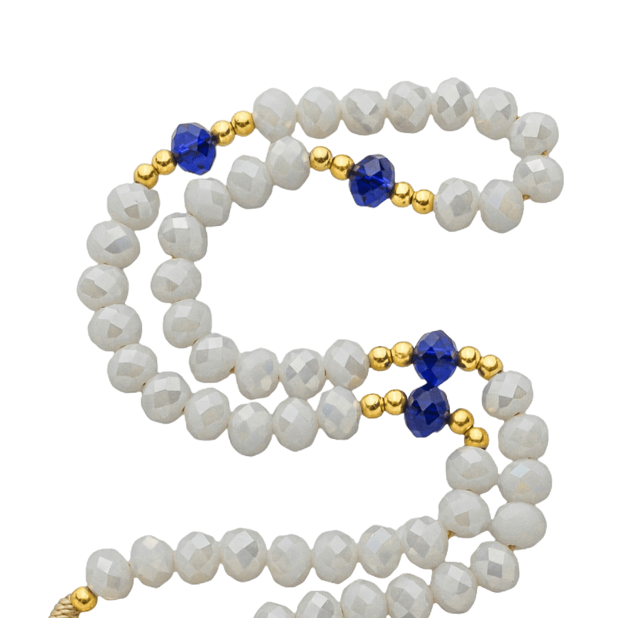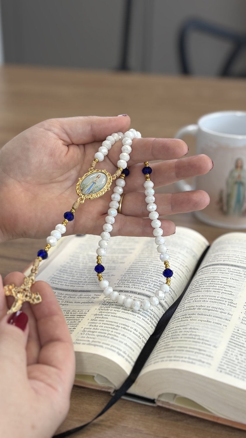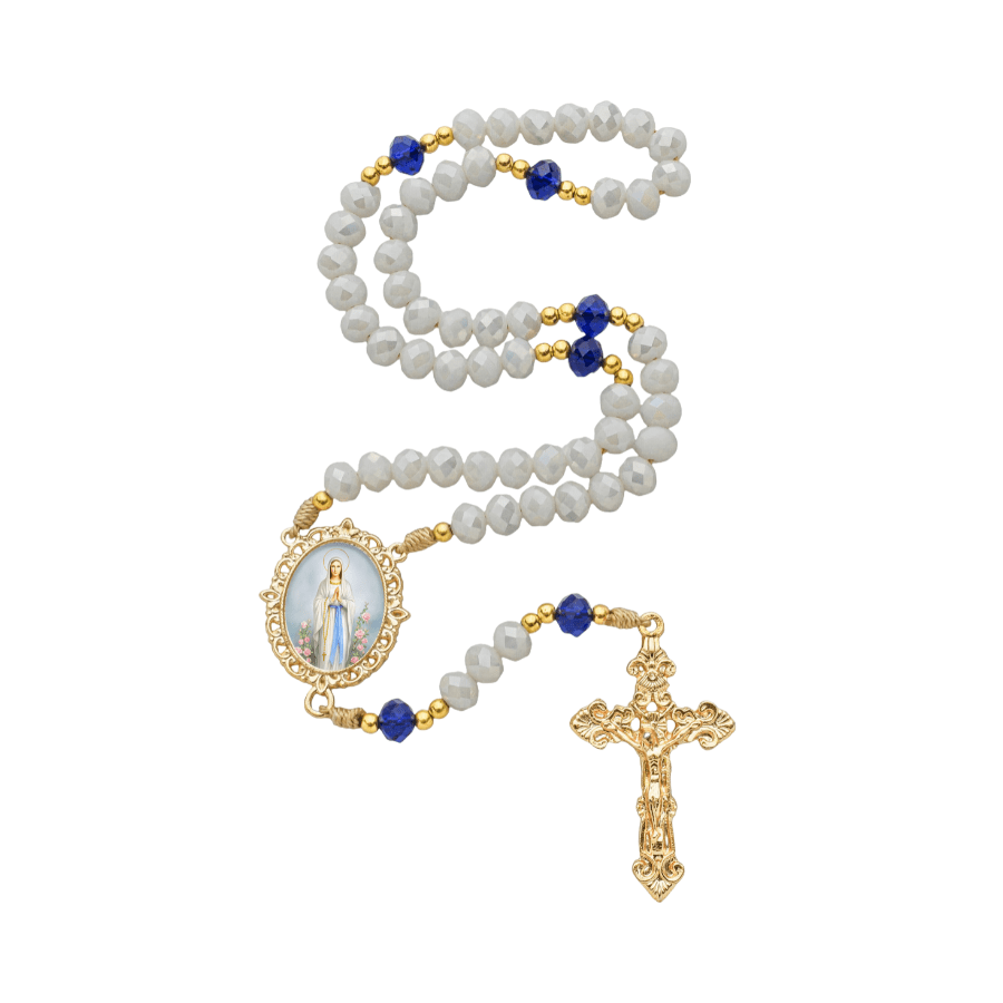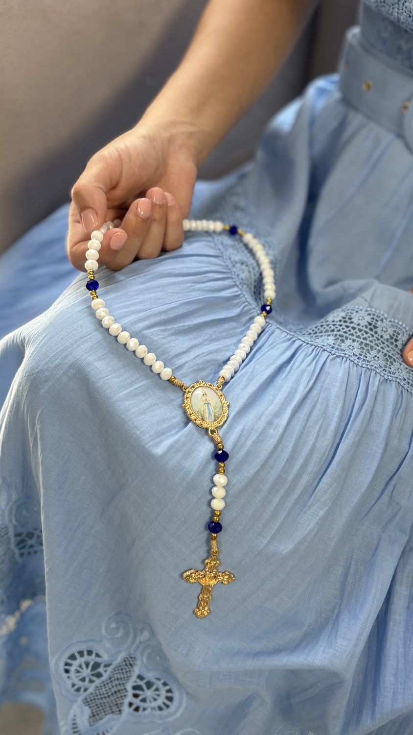 Contas de Cristal: As contas em cristal lapidado apresentam tonalidades translúcidas e suaves que harmonizam com a estética de Nossa Senhora de Lourdes (azul e branco), captando a luz de forma sublime.