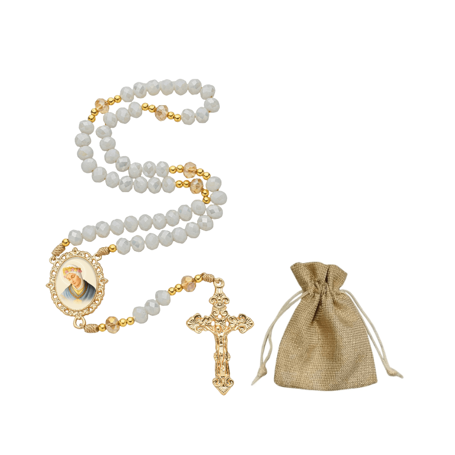 Terço Cristal Luxo Nossa Senhora de La Salette com Saquinho de Juta Dourado