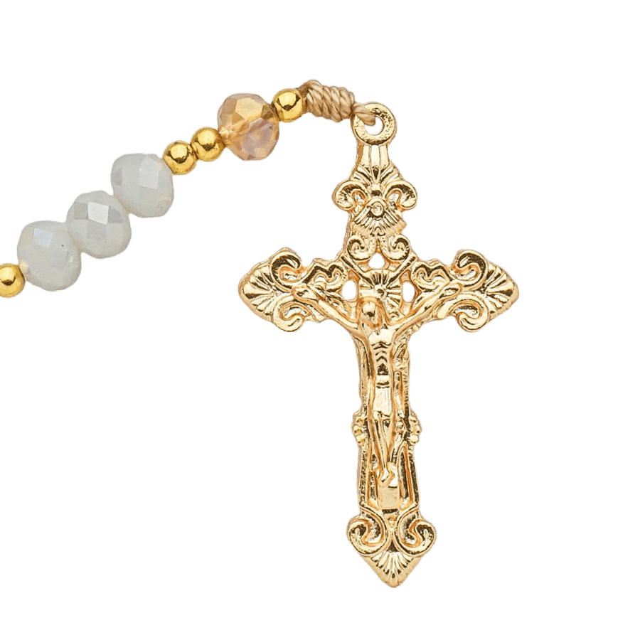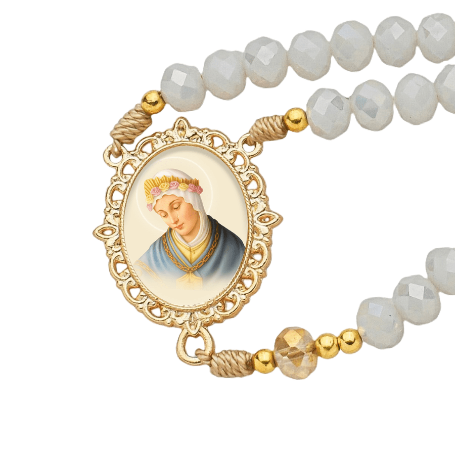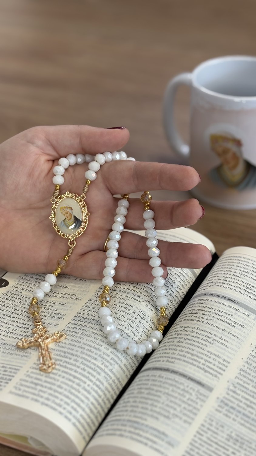 Paleta de Cores Suave: As contas das Ave-Marias em branco translúcido simbolizam a pureza da Virgem, enquanto os Pai-Nossos em tom doce de leite trazem um contraste acolhedor e clássico, harmonizando perfeitamente com a estampa de La Salette.