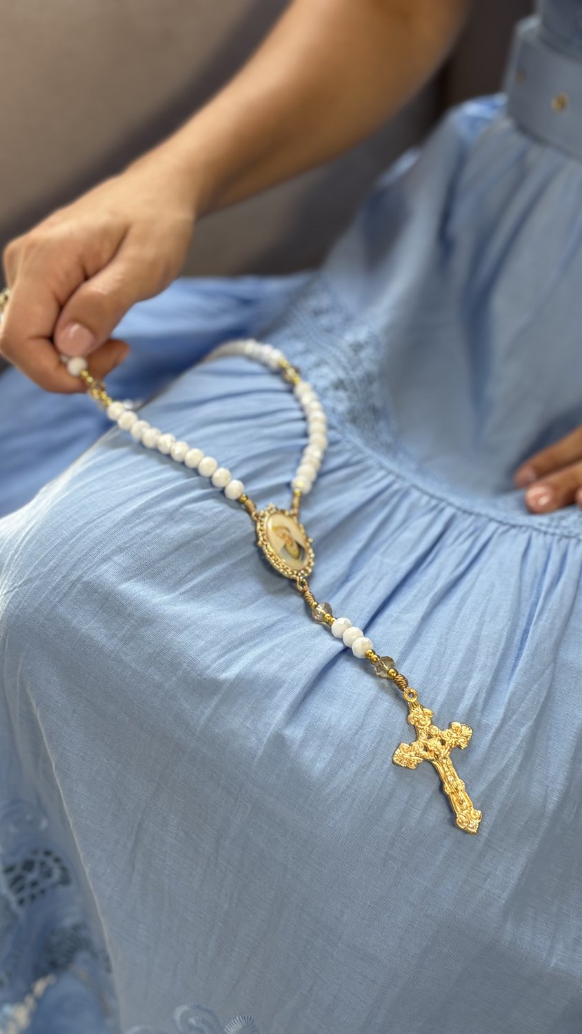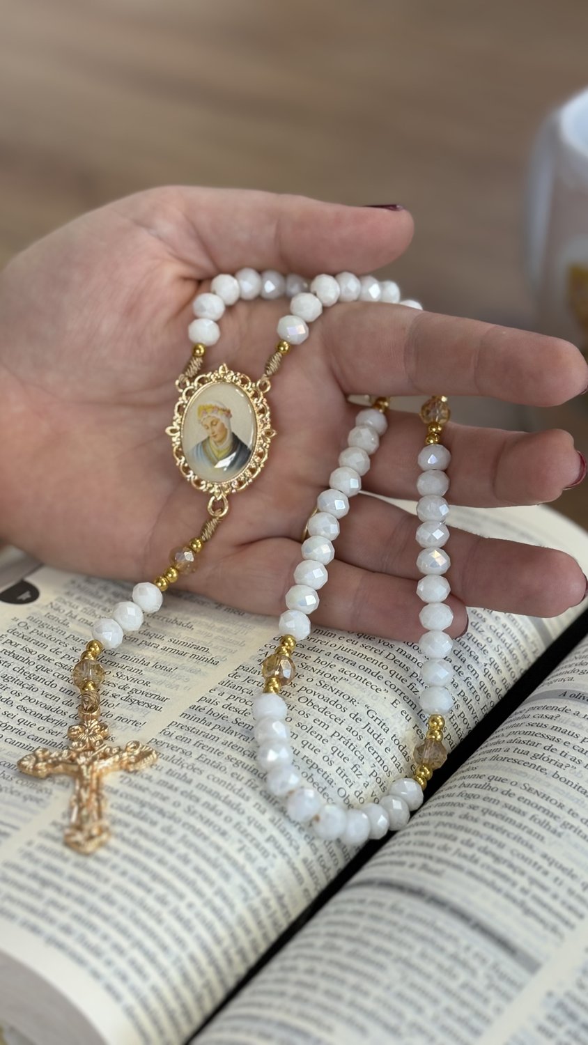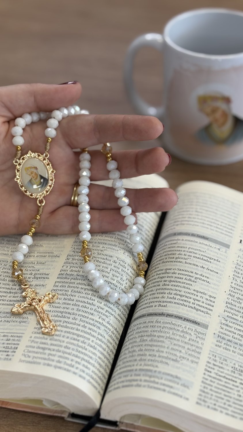Cada detalhe deste terço foi pensado para proporcionar uma experiência de oração elevada e esteticamente impecável: