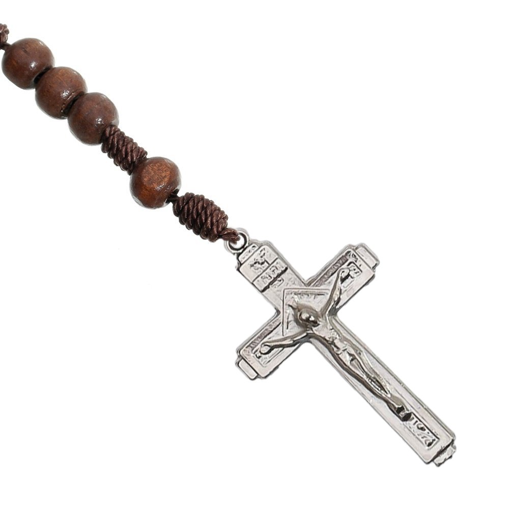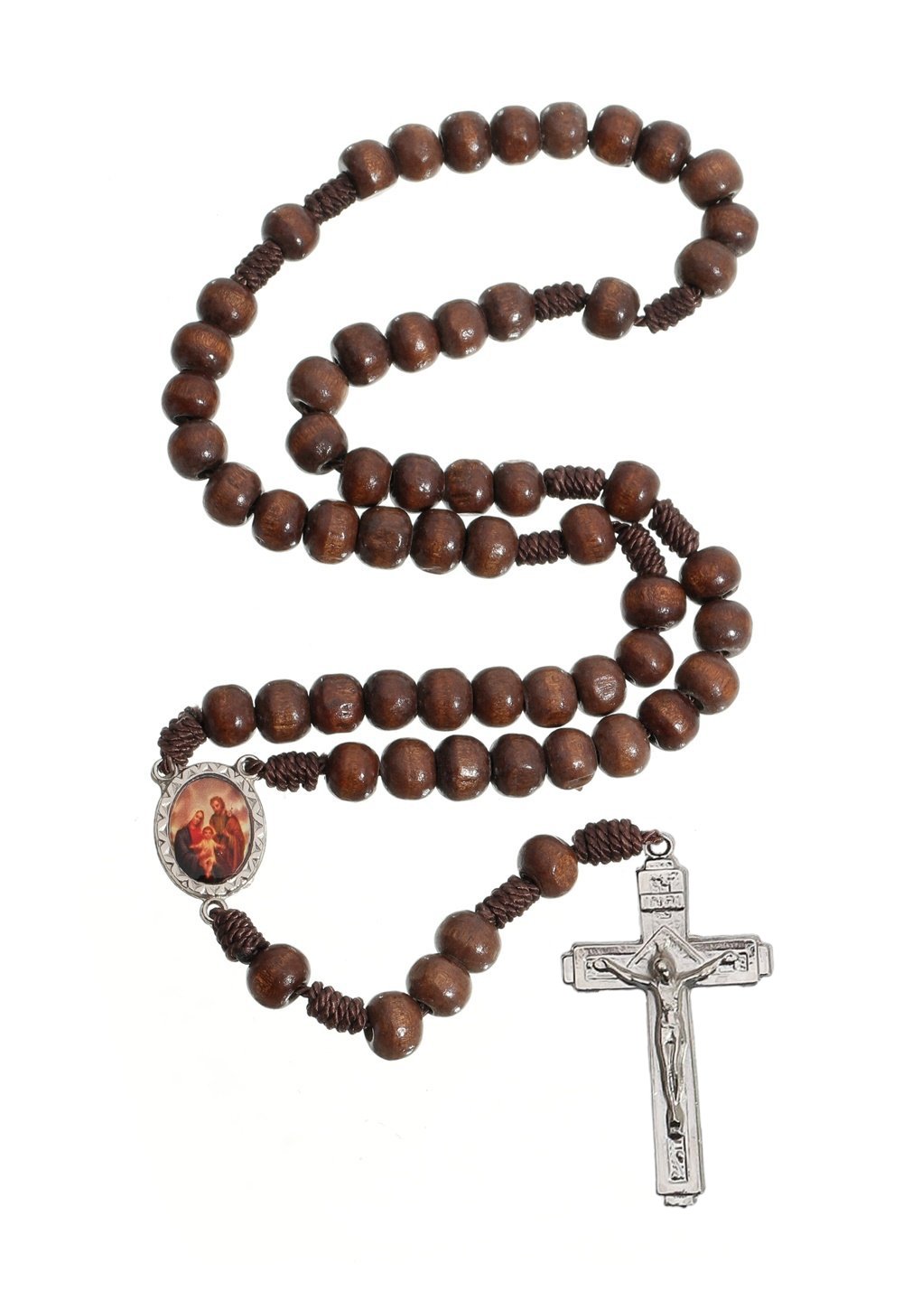 Terço com contas em madeira na cor marrom escuro, medalha na cor prata com imagem da Sagrada Família em resina colorida e crucifixo em metal prata.