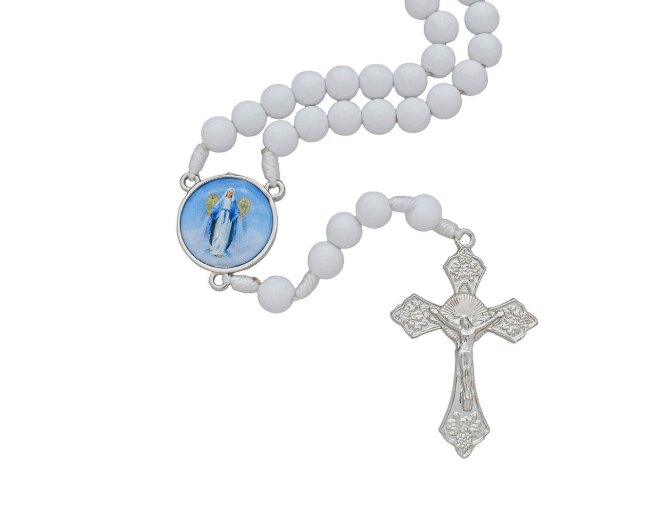 Adquira aqui este terço de Nossa Senhora das Graças com contas de pérola branca da Lírio do Vale Distribuidora de Artigos Religiosos!