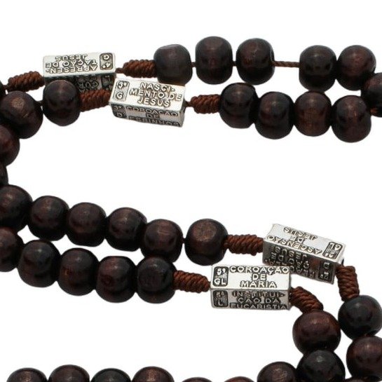 Este terço é confeccionado com contas de madeira de 10mm em um profundo tom de marrom escuro, proporcionando uma experiência de oração tátil e confortável. O grande destaque desta peça são as contas do "Pai Nosso", que consistem em peças metálicas prateadas gravadas com os quatro mistérios do Rosário (Gozosos, Luminosos, Dolorosos e Gloriosos).