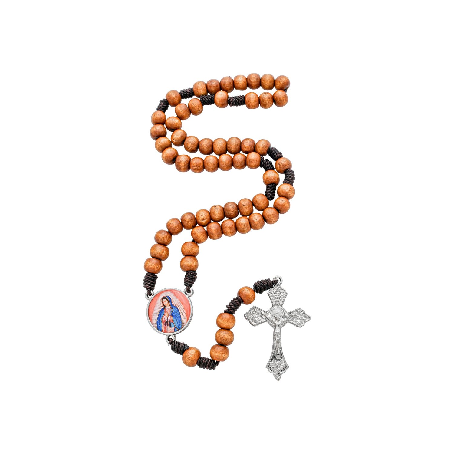 A Lírio do Vale Distribuidora de Artigos Religiosos apresenta com exclusividade no site este terço com contas em madeira clara! Com barbante marrom escuro, o produto possui contas emborrachadas na cor terracota, e em metal prata, uma medalha redonda com imagem resinada de Nossa Senhora de Guadalupe em fundo marrom claro e um crucifixo.