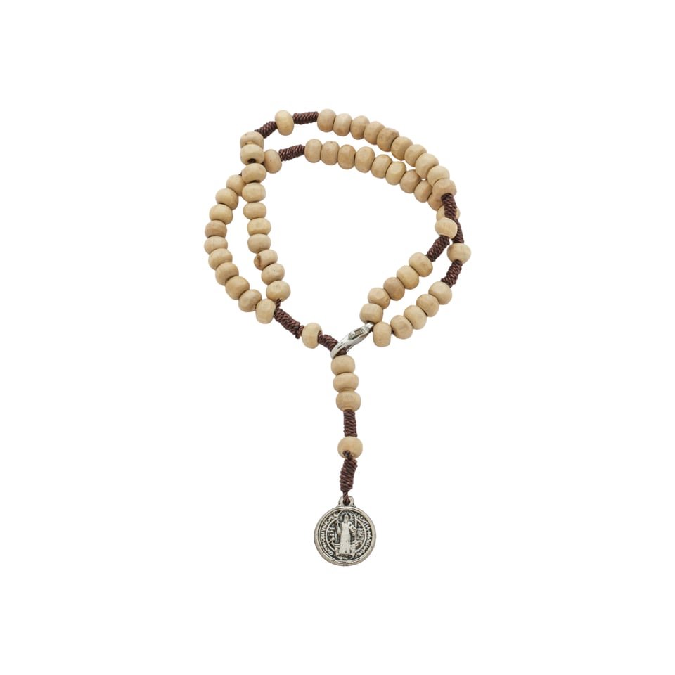 Terço de pulso com contas e entremeio de madeira na cor marfim, medalha em metal prata de São Bento, fecho em metal prata e barbante na cor marrom.