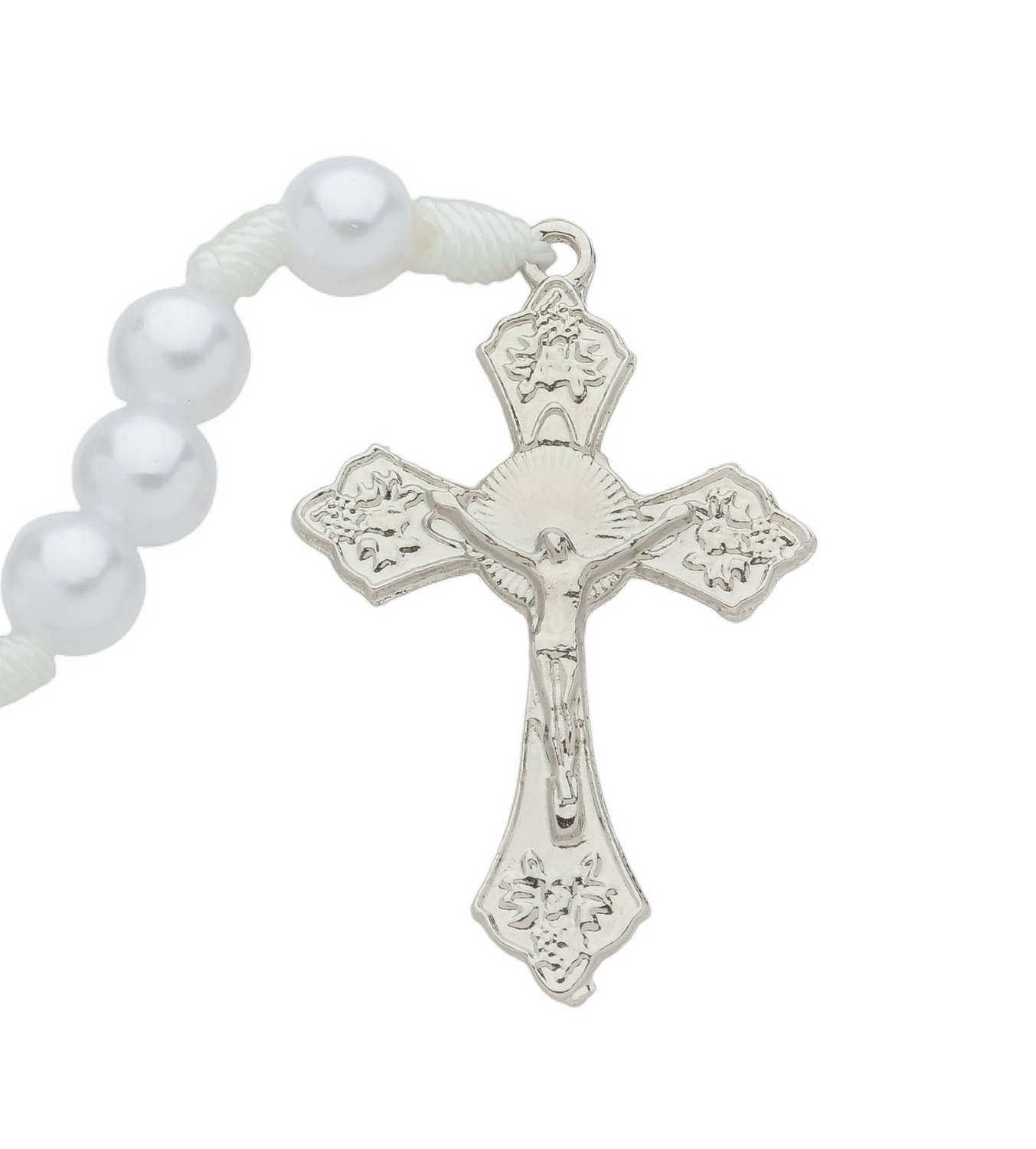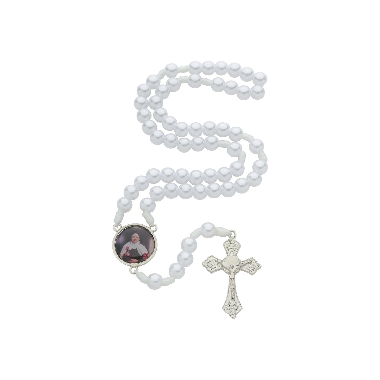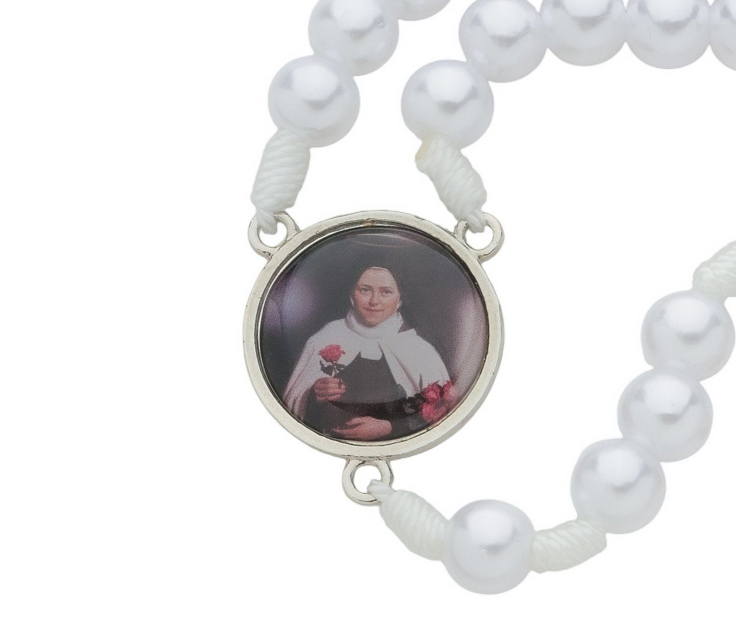 Terço de Santa Teresinha do Menino Jesus com barbante branco, contas craqueladas na cor branca, medalha oval com imagem colorida resinada e crucifixo em metal prata.