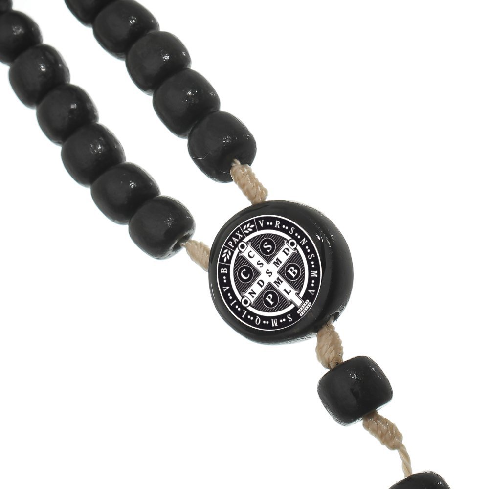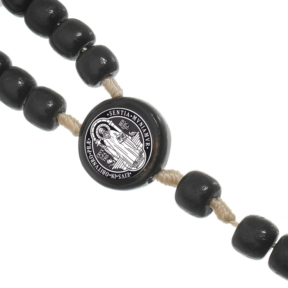 Lindo terço de pescoço com Medalha de São Bento. É feito com barbante e possui fecho. As contas são de madeira e pintadas na cor preta. Além de ficar belo como acessório, é perfeito como instrumento de oração, pois pode ser usado durante uma caminhada, no horário de almoço ou numa parada ao longo do dia para organizar os pensamentos e sentimentos. Muitas vezes depois de rezar o terço, algo difícil se descomplica, novos rumos e soluções aparecem. Esse terço de pescoço masculino é mais um belo produto da Lírio do Vale Artigos Religiosos.