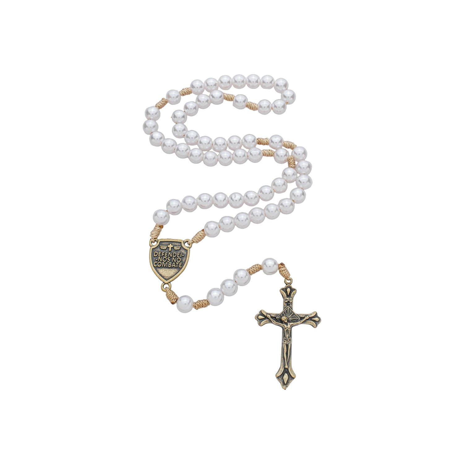 O visual clássico da pérola branca é harmonizado com metais em acabamento ouro velho, criando um contraste elegante que valoriza a peça. O ponto central de devoção é a medalha em formato de escudo, que simboliza a proteção divina contra as adversidades. Na frente, a medalha ostenta a imagem de São Miguel Arcanjo e, no verso, a poderosa jaculatória "Defendei-nos no combate", reforçando o propósito oracional de proteção espiritual.